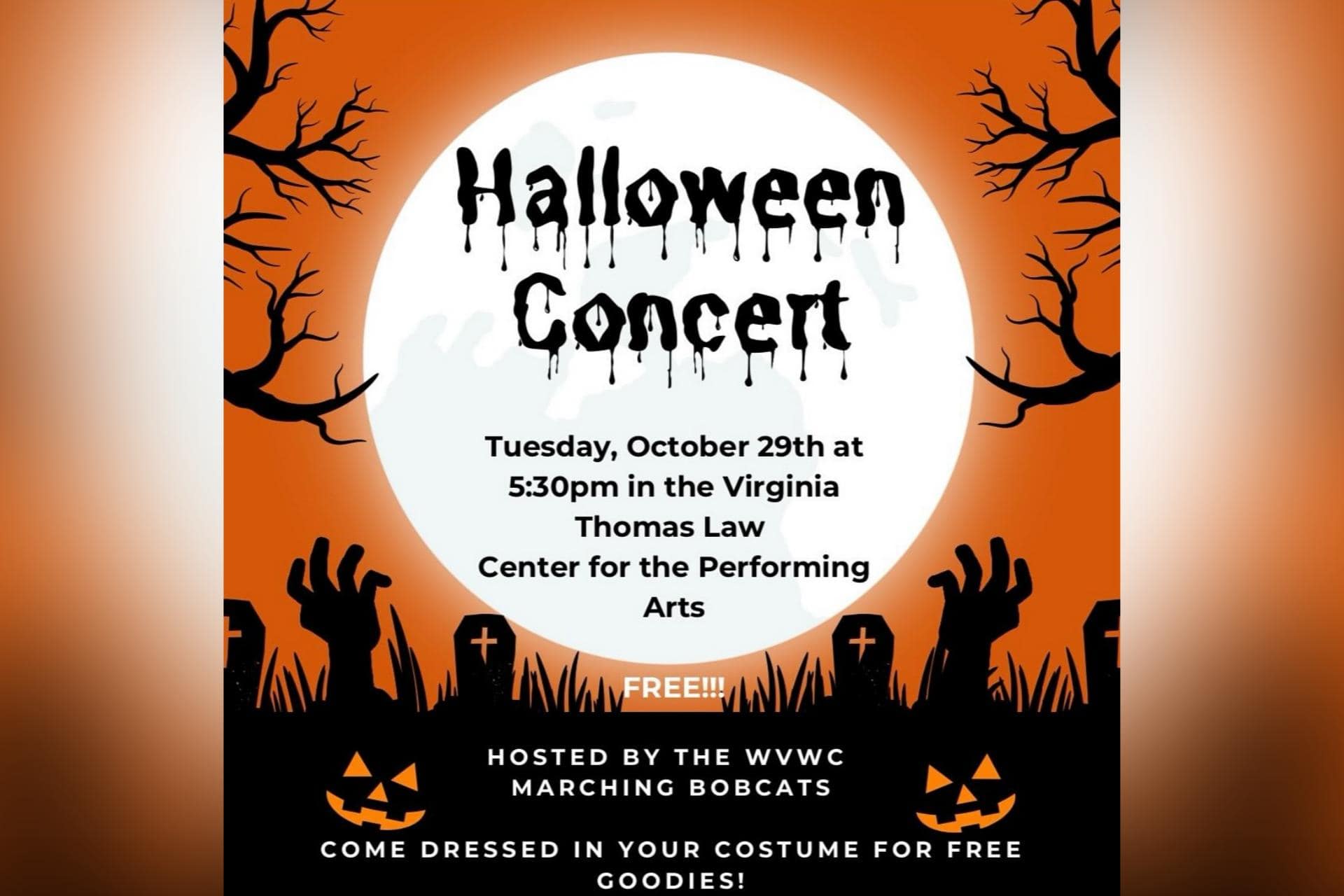 Area youth are invited to enjoy a short concert by the WVWC Marching Bobcats for some ghoulish tunes, sweet treats and a “spooktacular” time.