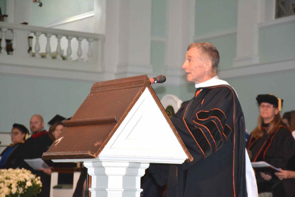 The Hon. John F. McCuskey ’69, Hon. ‘22 delivered the Founder’s Day address, and Retired Vice President of Advancement Bob Skinner ’75, in addition Jack ‘59 and Mary Ann ’60 Fraser were honored for their service to the College.