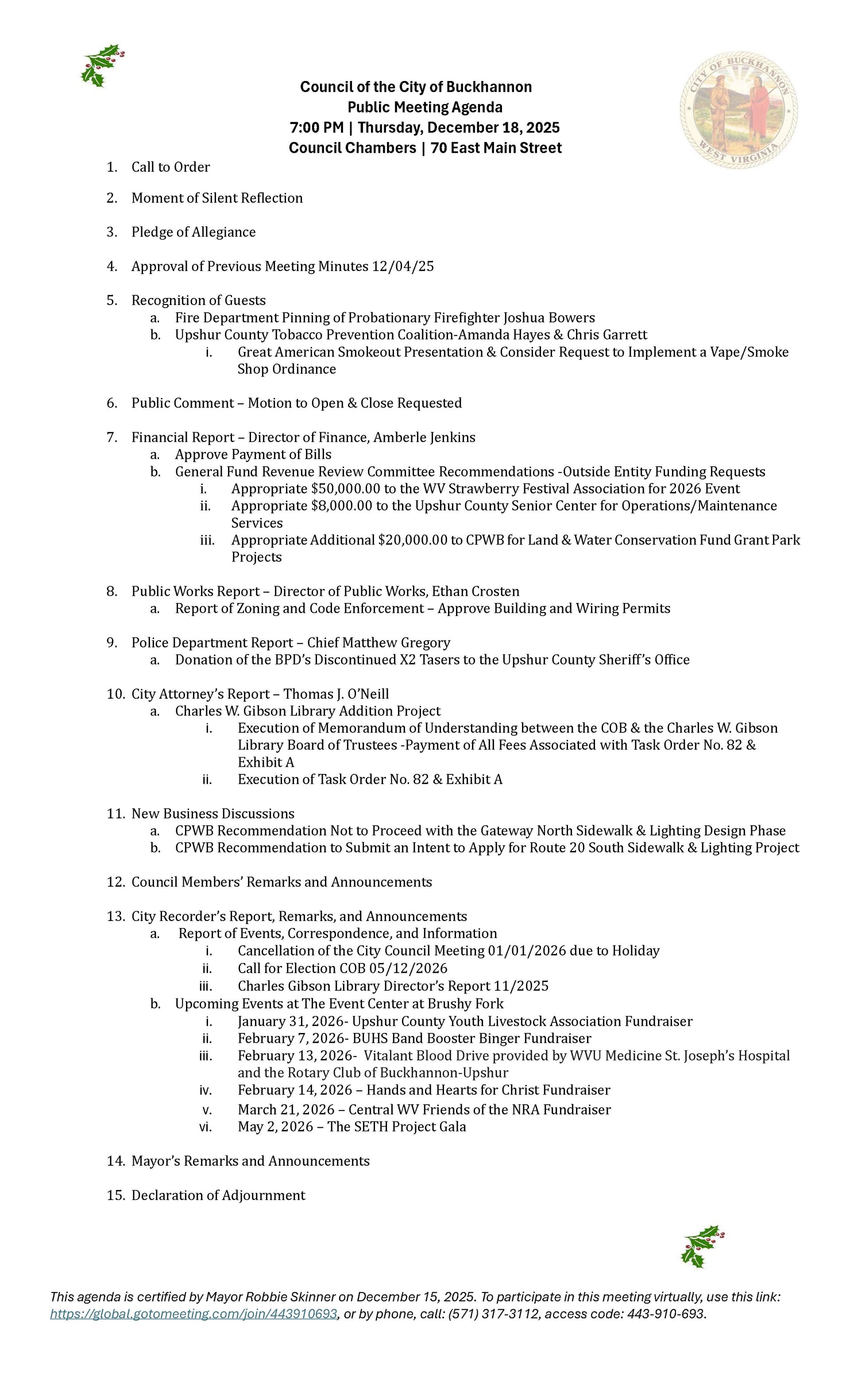 Here is the agenda for the Buckhannon City Council meeting scheduled for December 18, 2025.