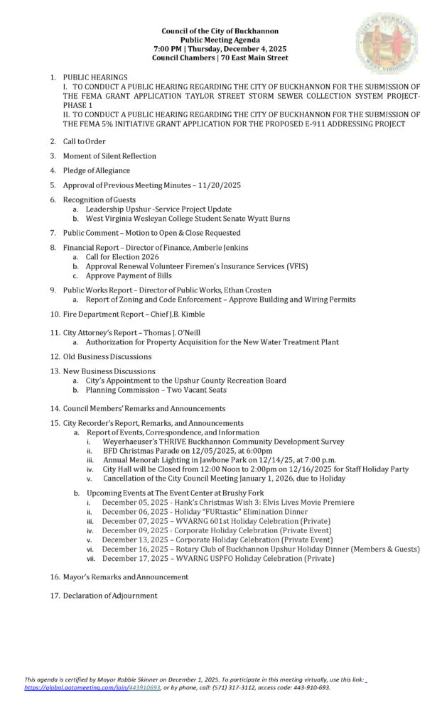 Here is the agenda for the Buckhannon City Council meeting scheduled for December 4, 2025.