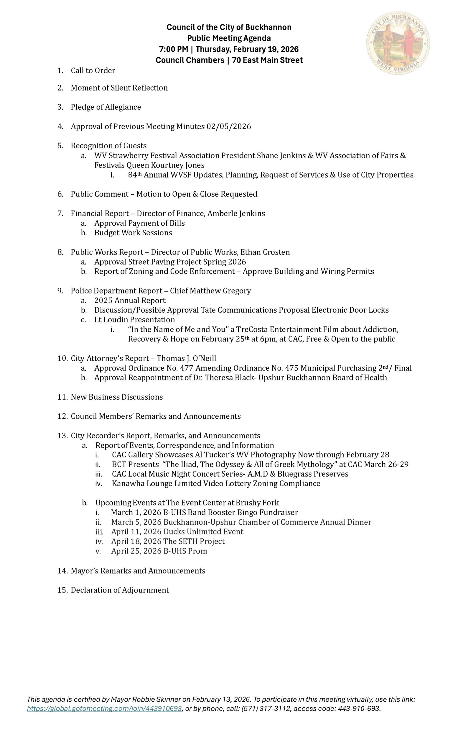 Here is the agenda for the Buckhannon City Council meeting scheduled for February 19, 2026.