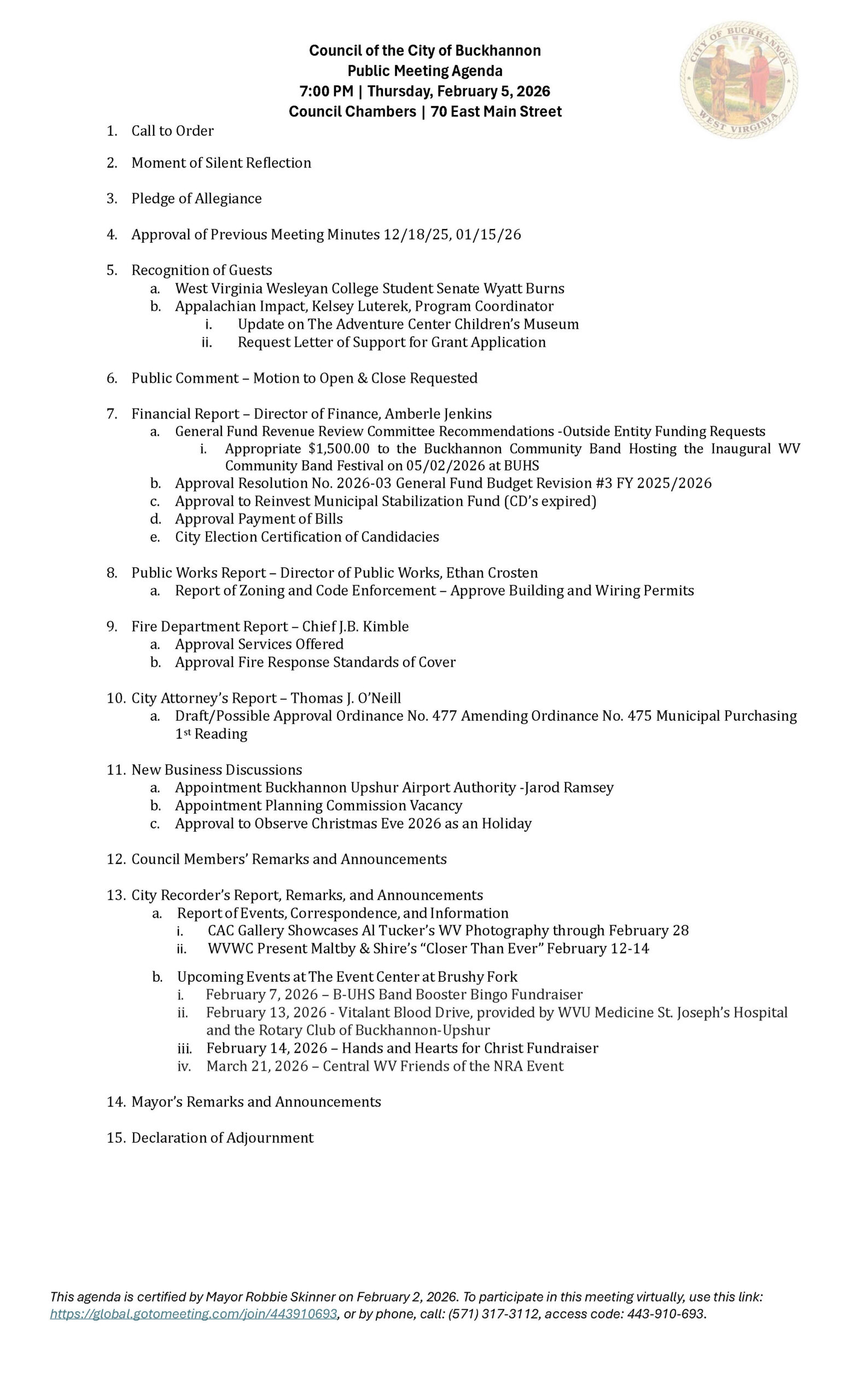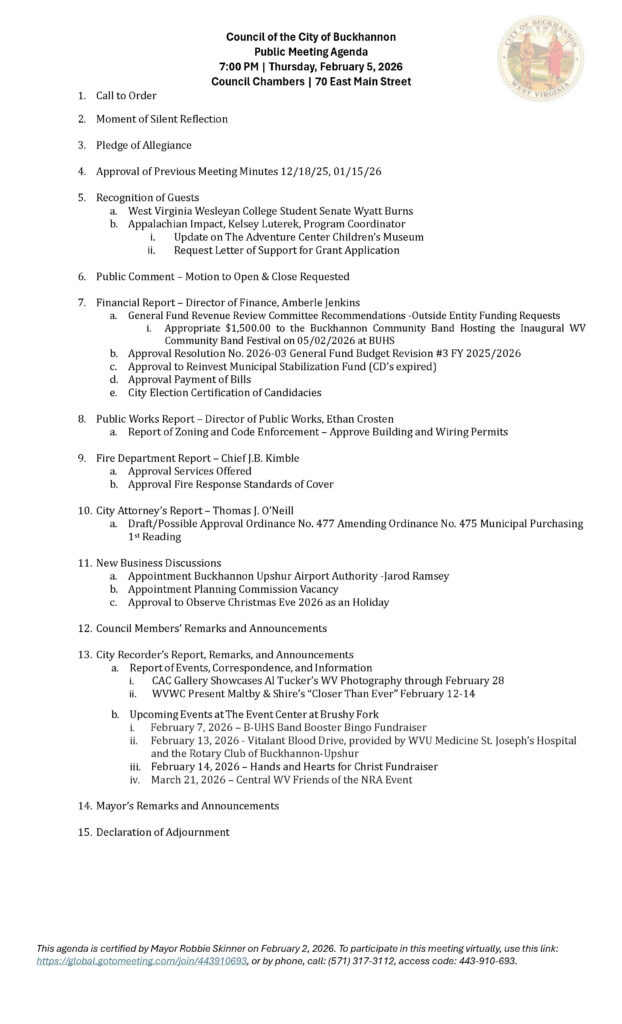 Here is the agenda for the Buckhannon City Council meeting scheduled for February 5, 2026.