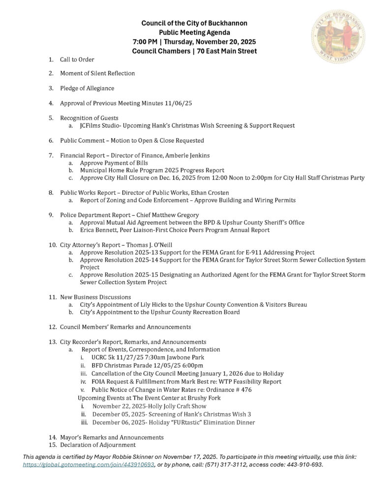 Here is the agenda for the Buckhannon City Council meeting scheduled for November 20, 2025.