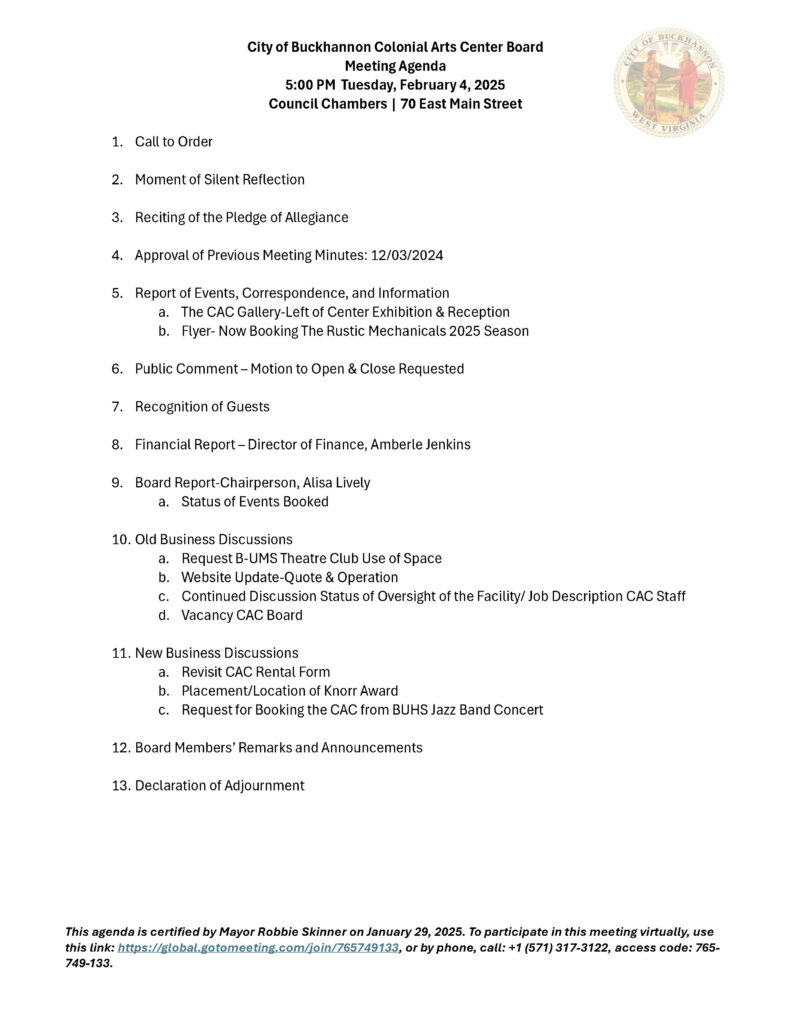 Here is the agenda for the City of Buckhannon Colonial Arts Center Board meeting scheduled for February 4, 2025.