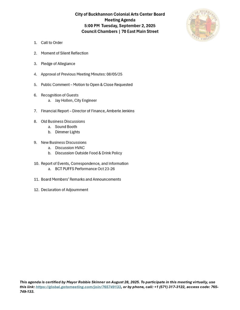 Here is the agenda for the City of Buckhannon Colonial Arts Center Board meeting scheduled for September 2, 2025.
