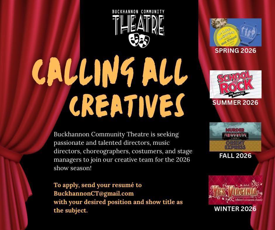 Buckhannon Community Theatre is recruiting directors, music directors, choreographers, costumers and stage managers to help mount its 2026 season, according to a recent announcement.