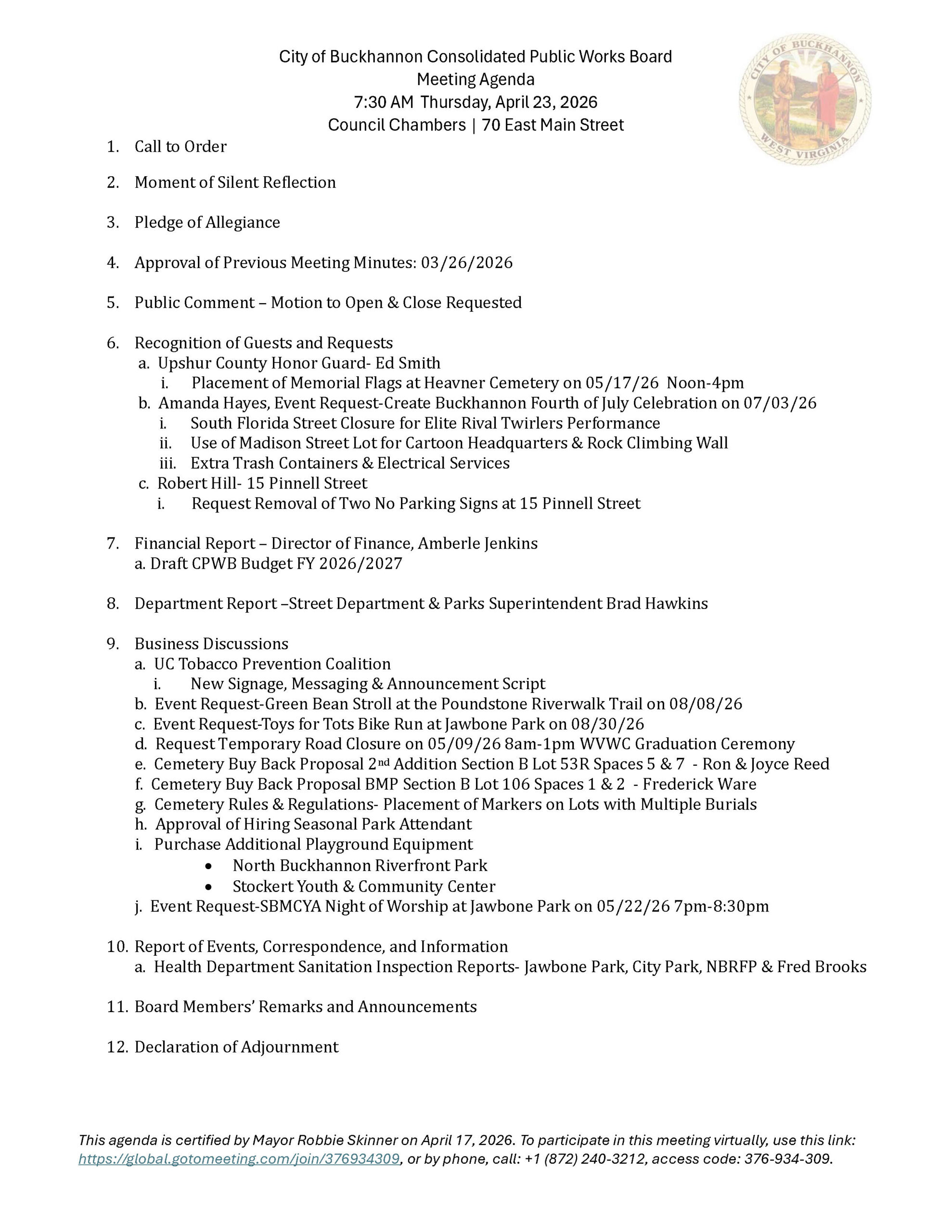 Here is the agenda for the City of Buckhannon Consolidated Public Works Board meeting scheduled for April 23, 2026.