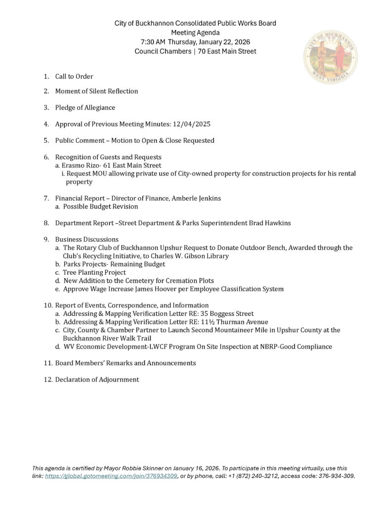 Here is the agenda for the City of Buckhannon Consolidated Public Works Board meeting scheduled for January 22, 2026.