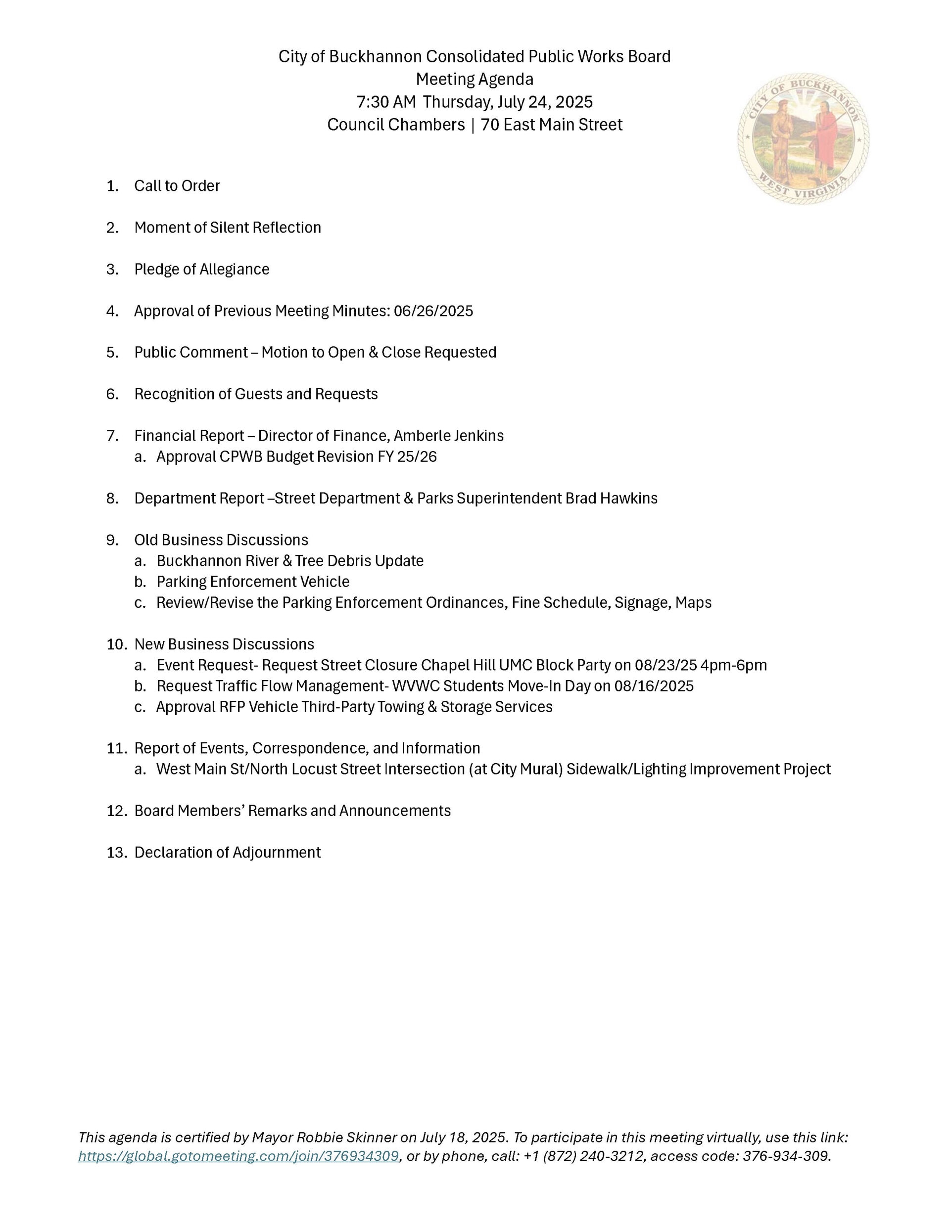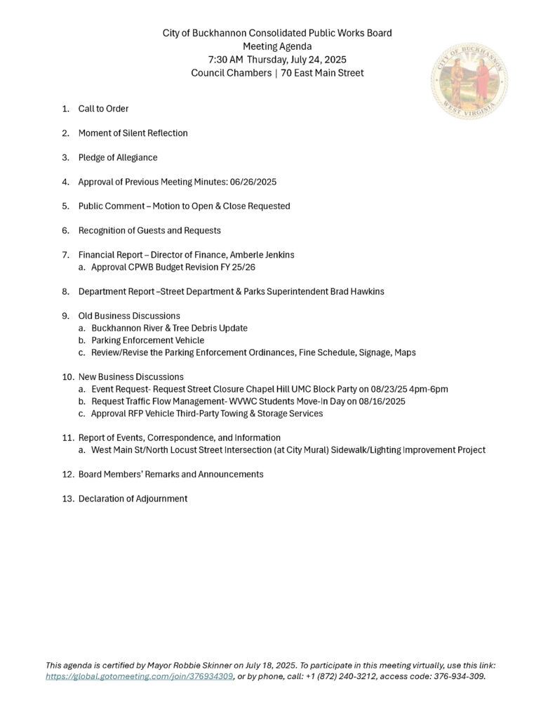 The City of Buckhannon Consolidated Public Works Board released the agenda for its upcoming meeting scheduled for July 24, 2025.