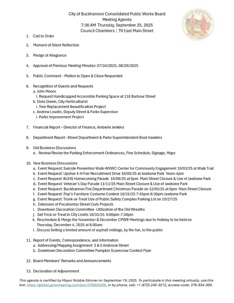 Here is the agenda for the City of Buckhannon Consolidated Public Works Board meeting scheduled for September 25, 2025.
