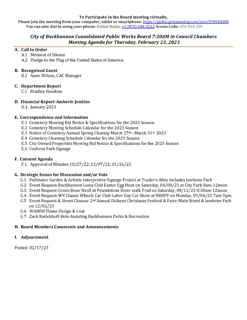 Here is the agenda for the City of Buckhannon Consolidated Public Works Board meeting scheduled for February 23, 2023.