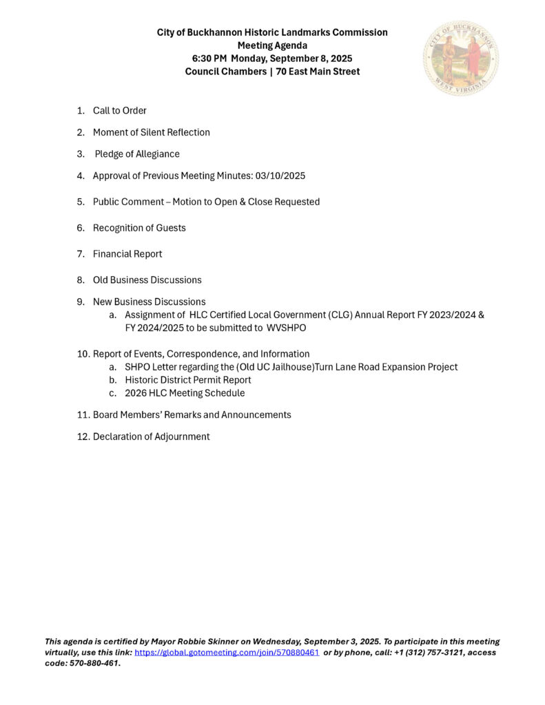 Here is the agenda for the City of Buckhannon Historical Landmarks Commission meeting scheduled for September 8, 2025.