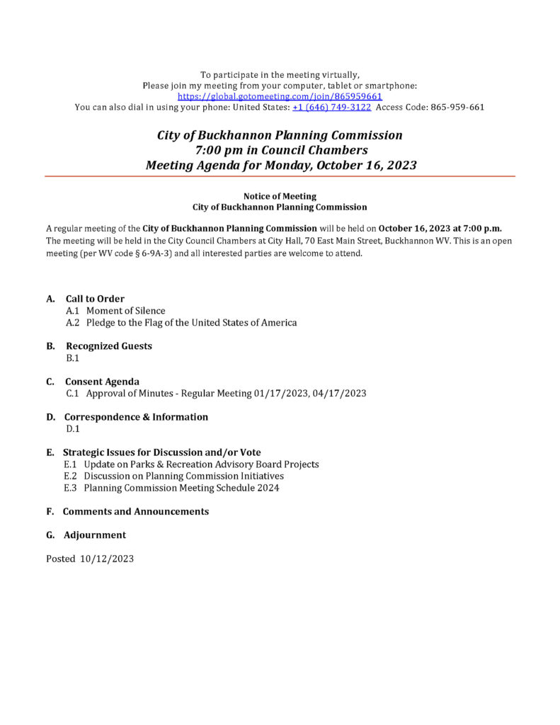 Here is the agenda for the City of Buckhannon Planning Commission meeting scheduled for Oct. 16, 2023.