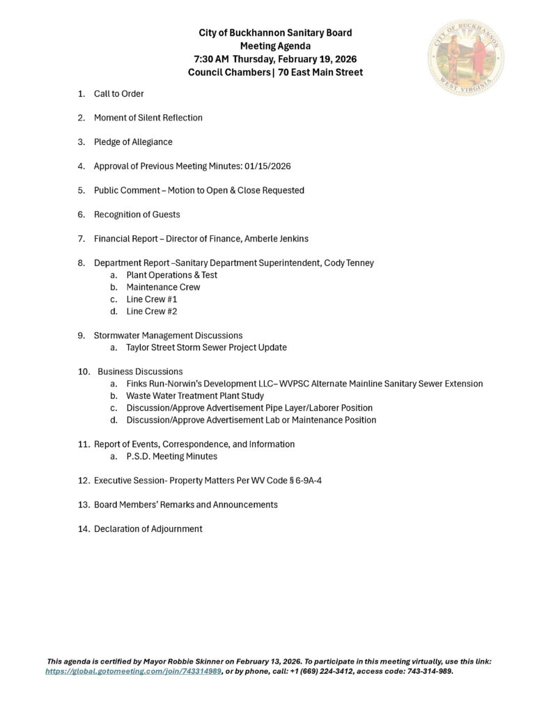 Here is the agenda for the Buckhannon Sanitary Board meeting scheduled for February 19, 2026.