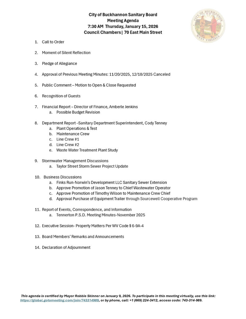 Here is the agenda for the Buckhannon Sanitary Board meeting scheduled for January 15, 2026.
