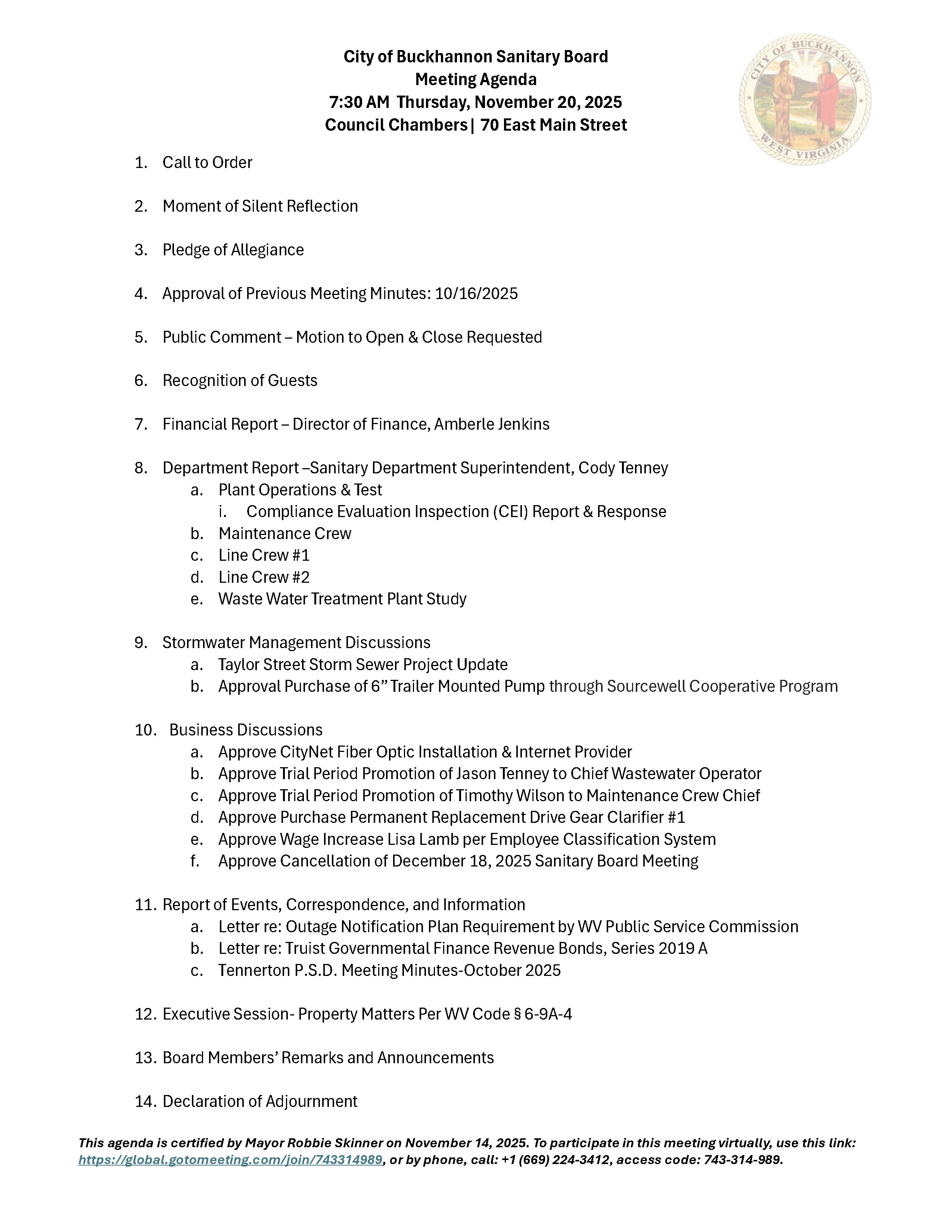 Here is the agenda for the Buckhannon Sanitary Board meeting scheduled for November 20, 2025.
