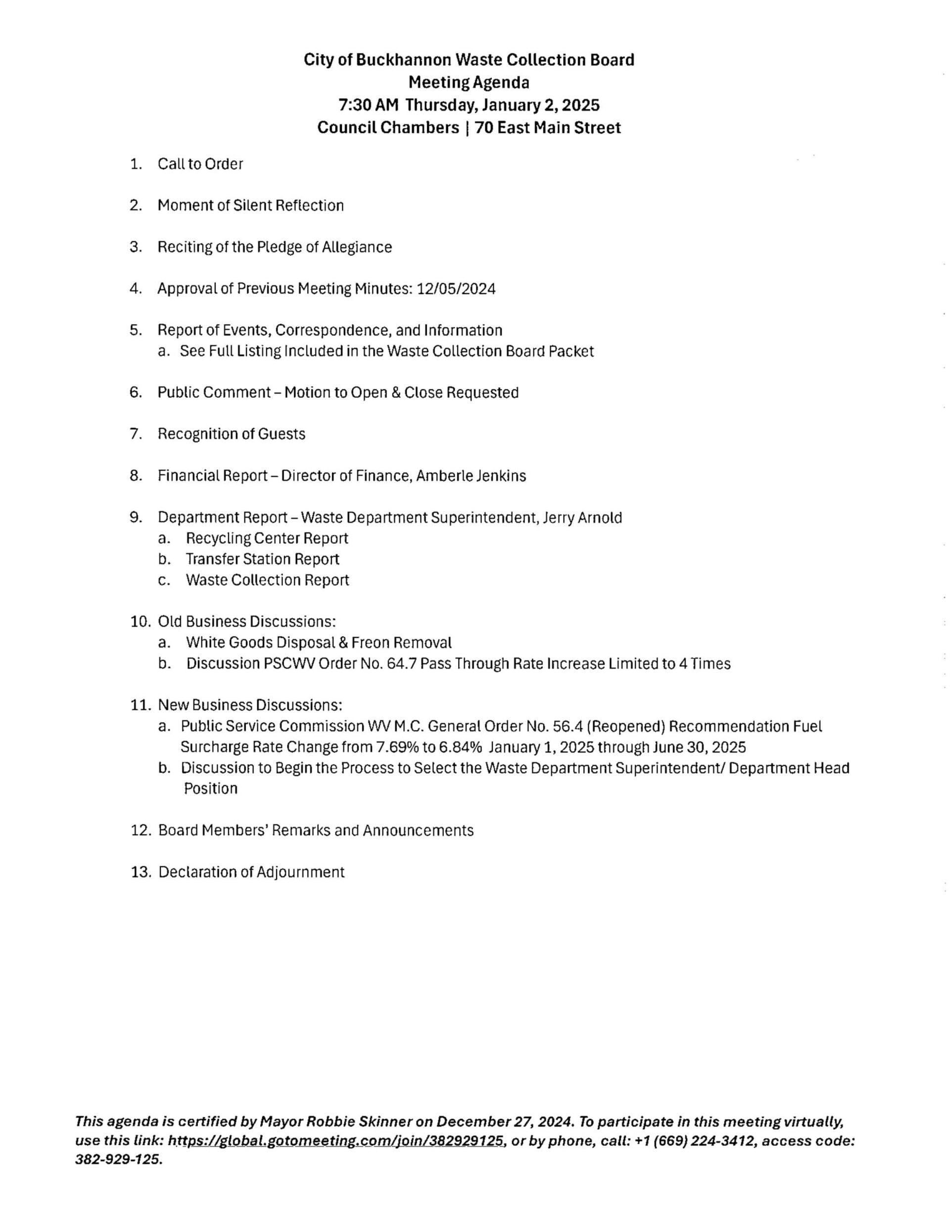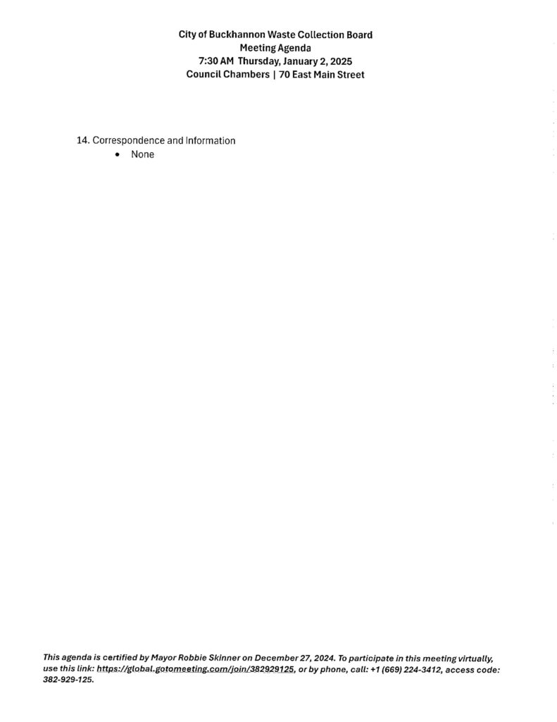 Here is the agenda for the City of Buckhannon Waste Board meeting scheduled for January 2, 2025.