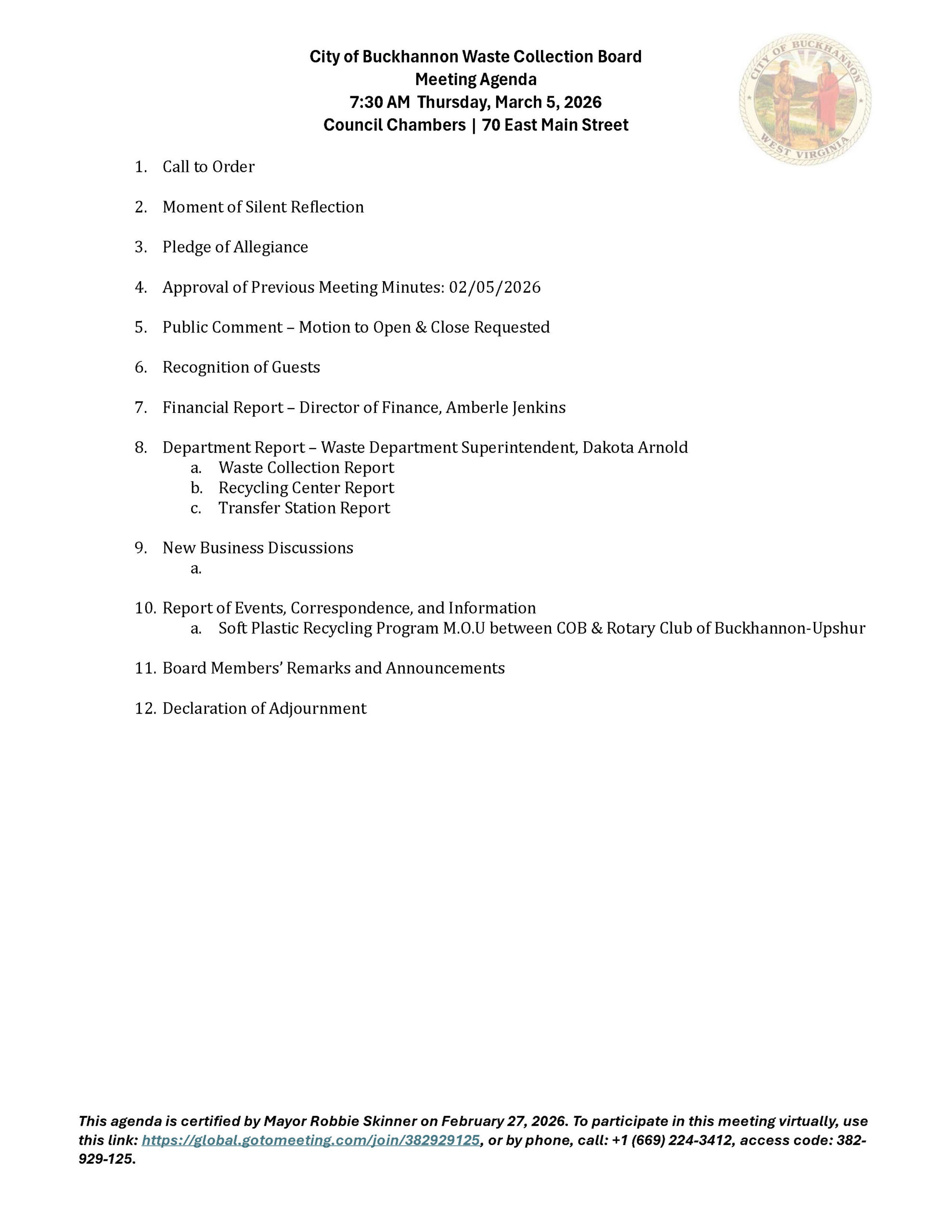 Here is the agenda for the City of Buckhannon Waste Collection Board meeting scheduled for March 5, 2026.