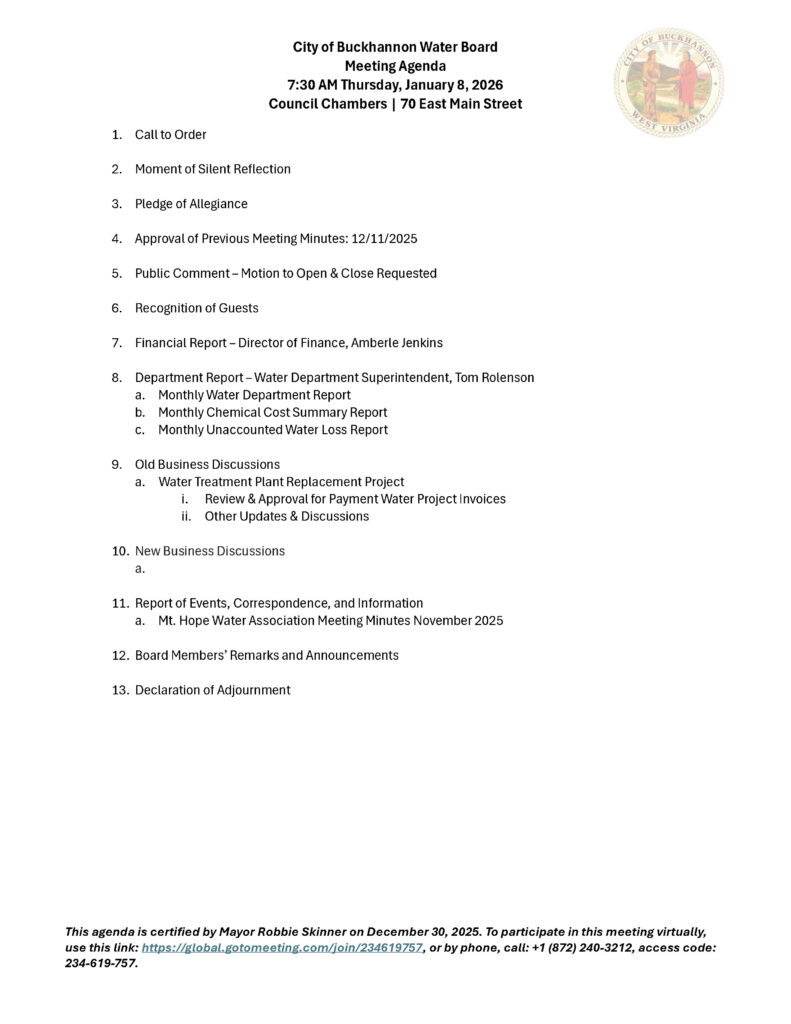 Here is the agenda for the City of Buckhannon Water Board meeting scheduled for January 8, 2026.