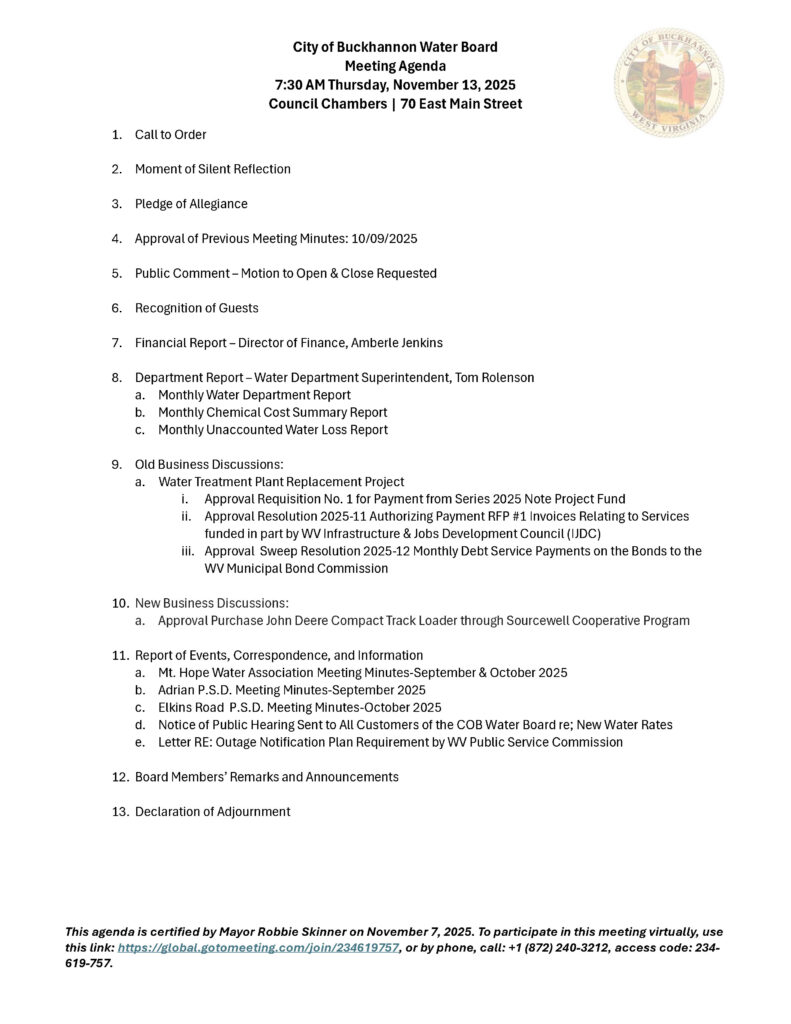 Here is the agenda for the City of Buckhannon Water Board meeting scheduled for November 13, 2025.