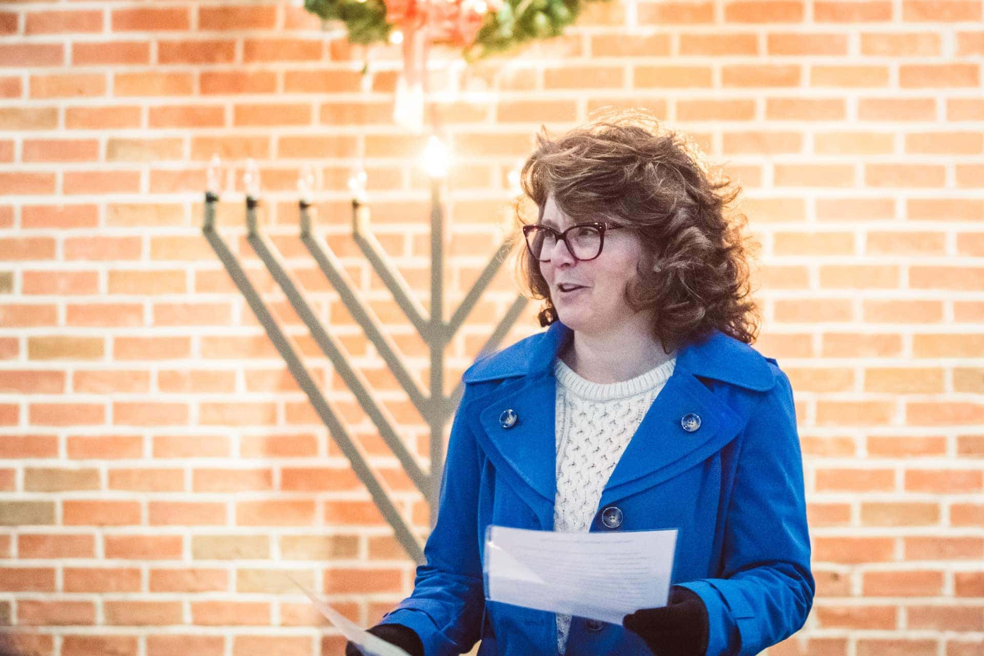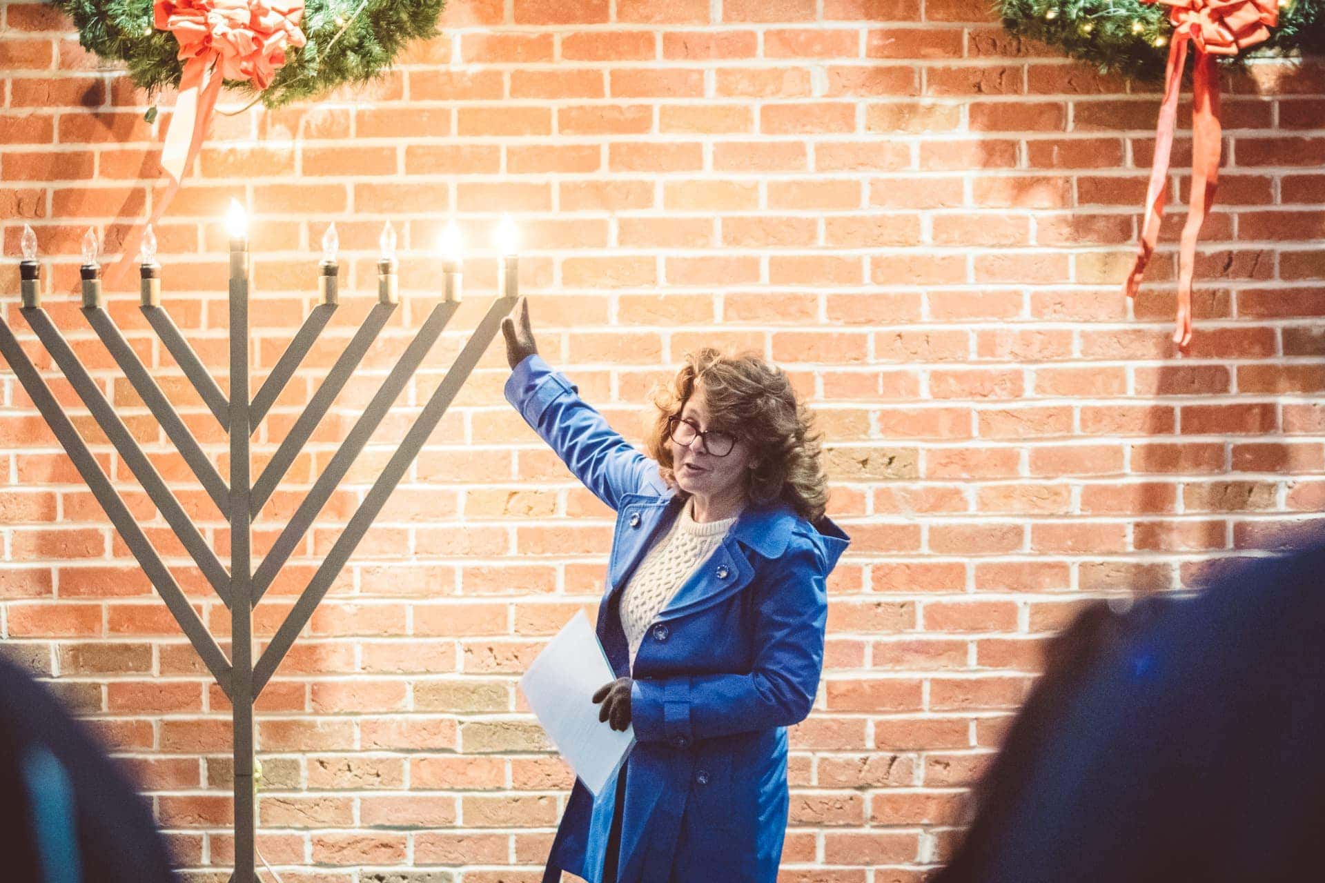 She then invited those in attendance to come forward and join her in a Chanukah candle lighting blessing.