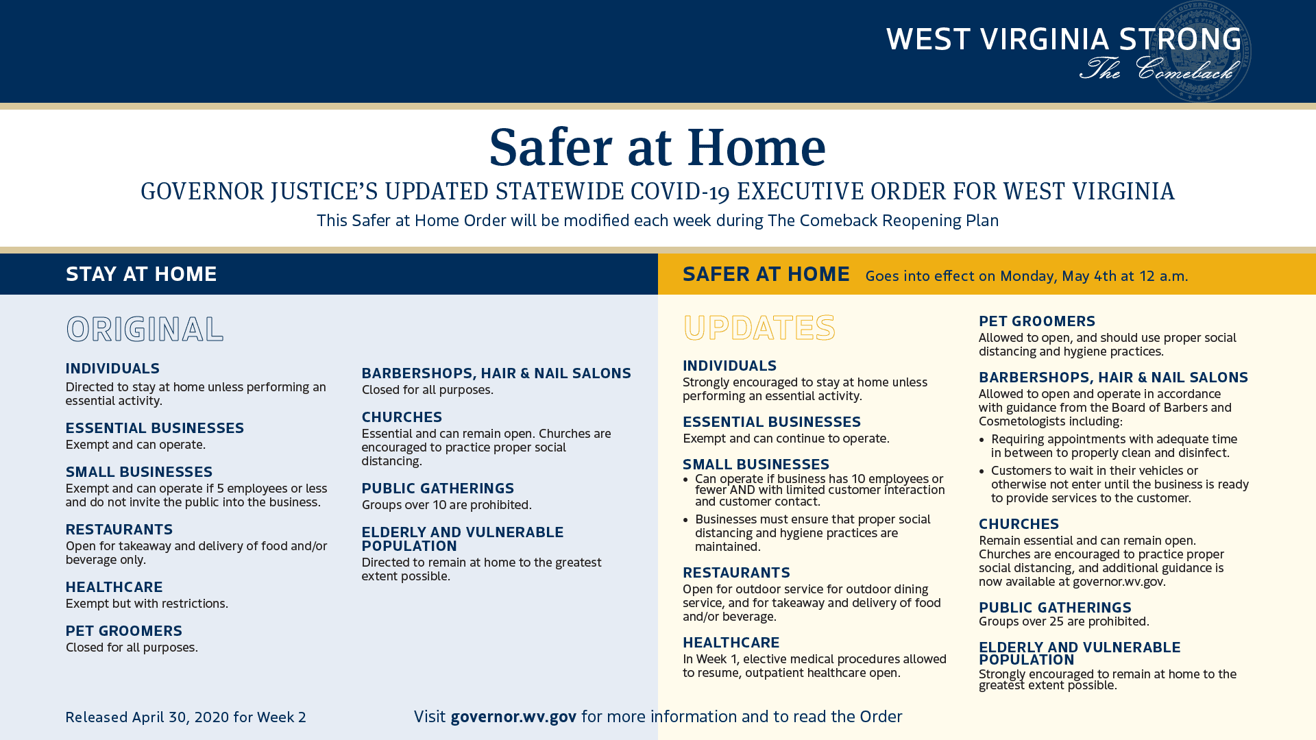 Earlier in the day, Gov. Jim Justice said he plans to lift the current stay-at-home order on Monday. It will be replaced with a “safer-at-home” order as detailed in the chart below.