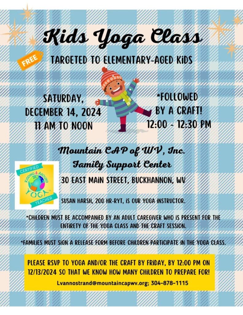 Families seeking an engaging and healthy Saturday activity can find it at Mountain CAP of WV, Inc.’s Family Support Center on East Main Street. On Saturday, December 14, 2024, the center will host its monthly free children’s yoga class, followed by a craft session, providing a morning of movement, creativity and community connection.
