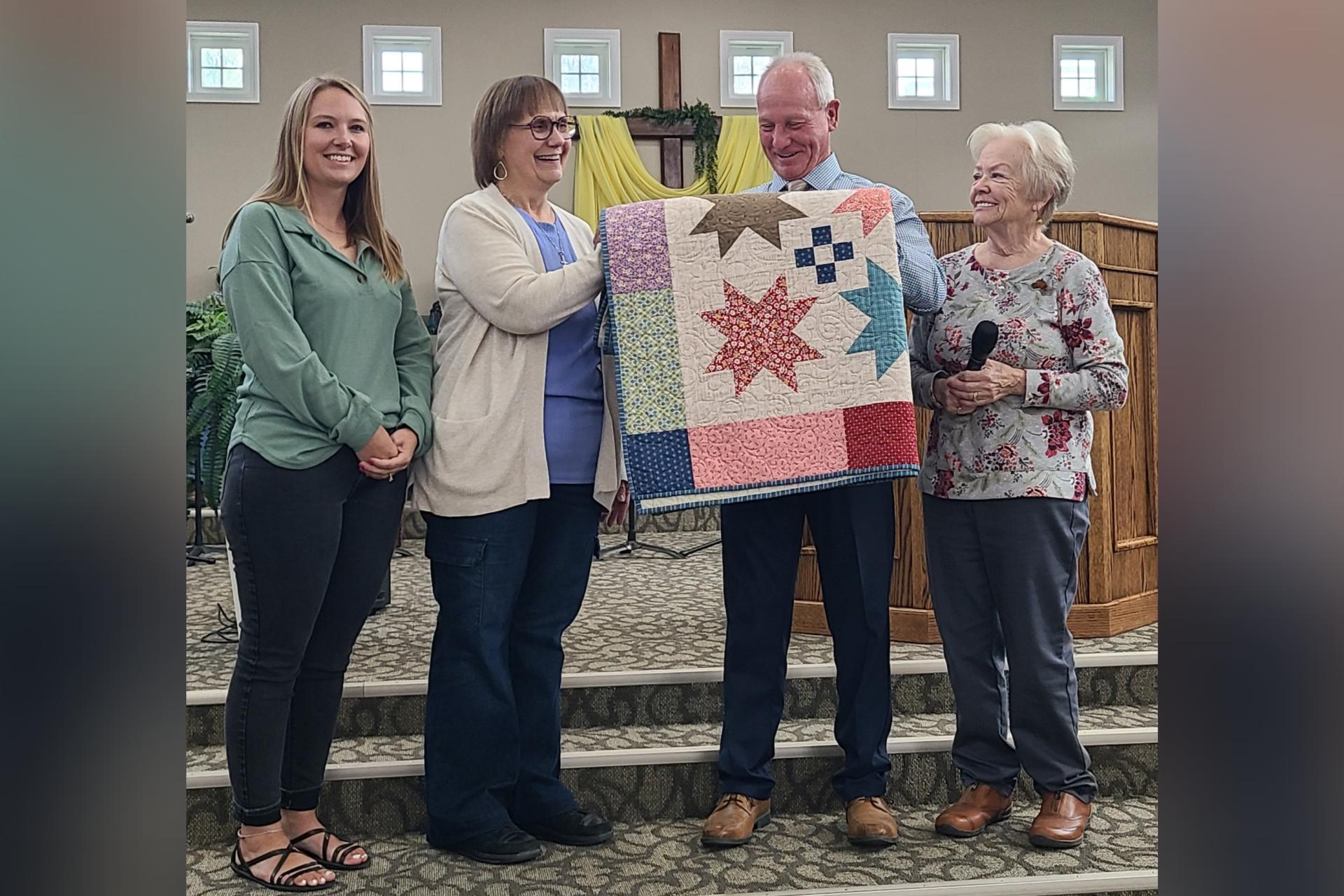 On October 9, 2025, Quilters at Heart Quilt Guild of Buckhannon held the drawing for their 2025 Charity Raffle Quilt. The lucky winner of this year’s “Harvest Stars” quilt was Rev. Ed Lowther.