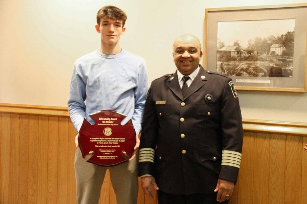 BUCKHANNON – The West Virginia State Fire Marshal honored a local high school senior for rescuing his neighbor from a perilous and potentially life-threatening fire during Thursday’s Upshur County Commission meeting.
