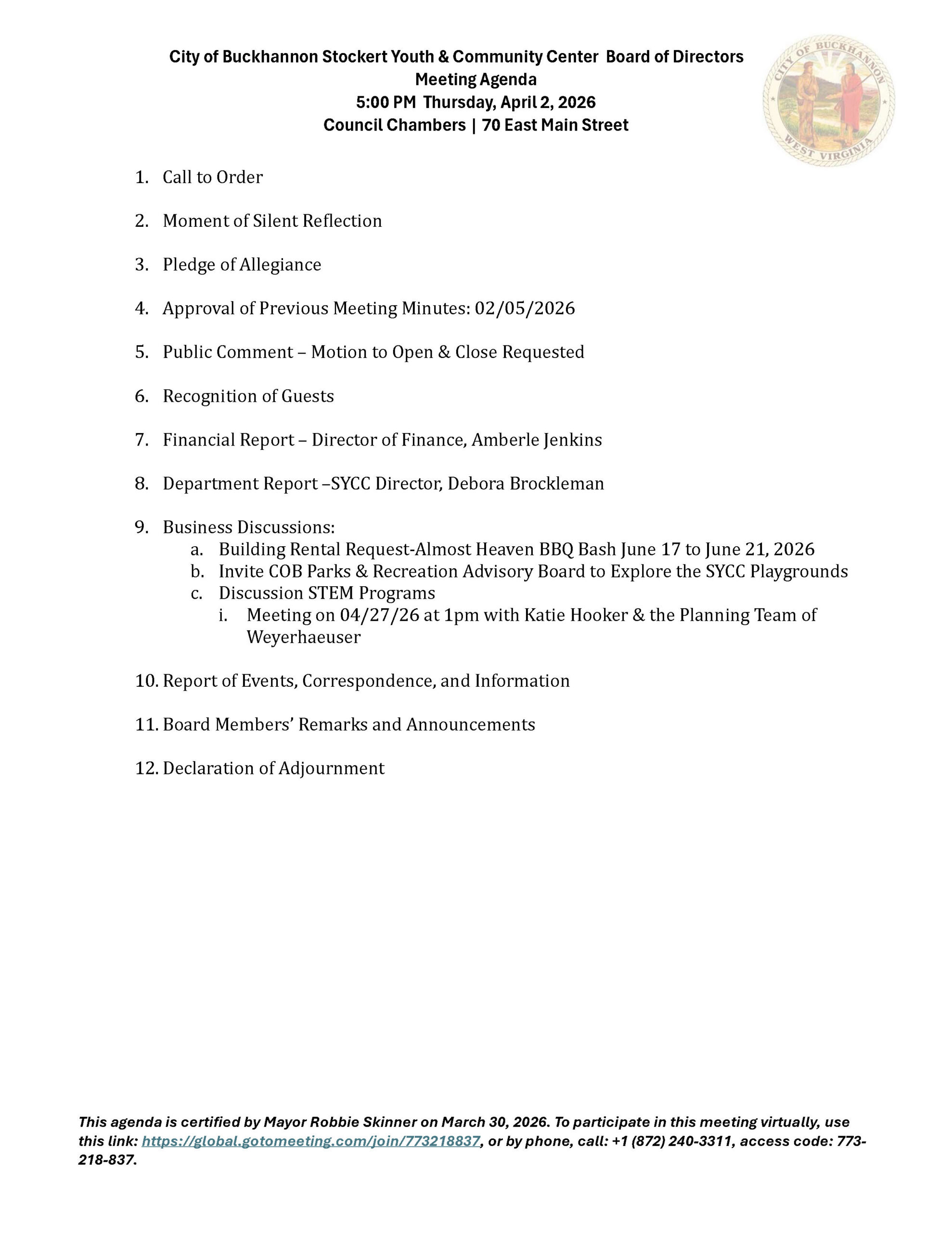 Here is the agenda for the City of Buckhannon Stockert Youth and Community Center Board meeting scheduled for April 2, 2026.