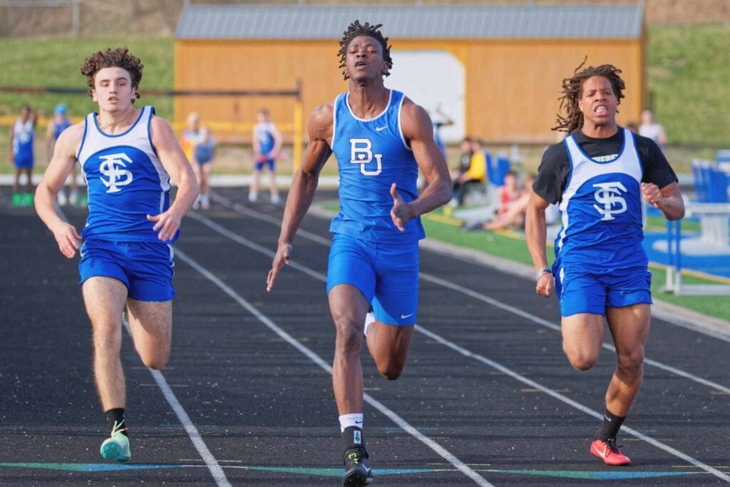 B-U senior Taiwo Thropp won the 100-meter dash (11.39) and 200-meter dash (22.64) – setting a meeting record in latter – and was a member of the first-place 4×200 and 4×400 relay teams. Joining Thropp on the 4×200 (1:36.19) were Bryson Johnston, Landon Marple and Malaki Williams, while the 4×400 squad – which also set a meet record with a time of 3:39.57 – consisted of Thropp, Shawn Blandino, Jordan Gillum and Reis Leonard.