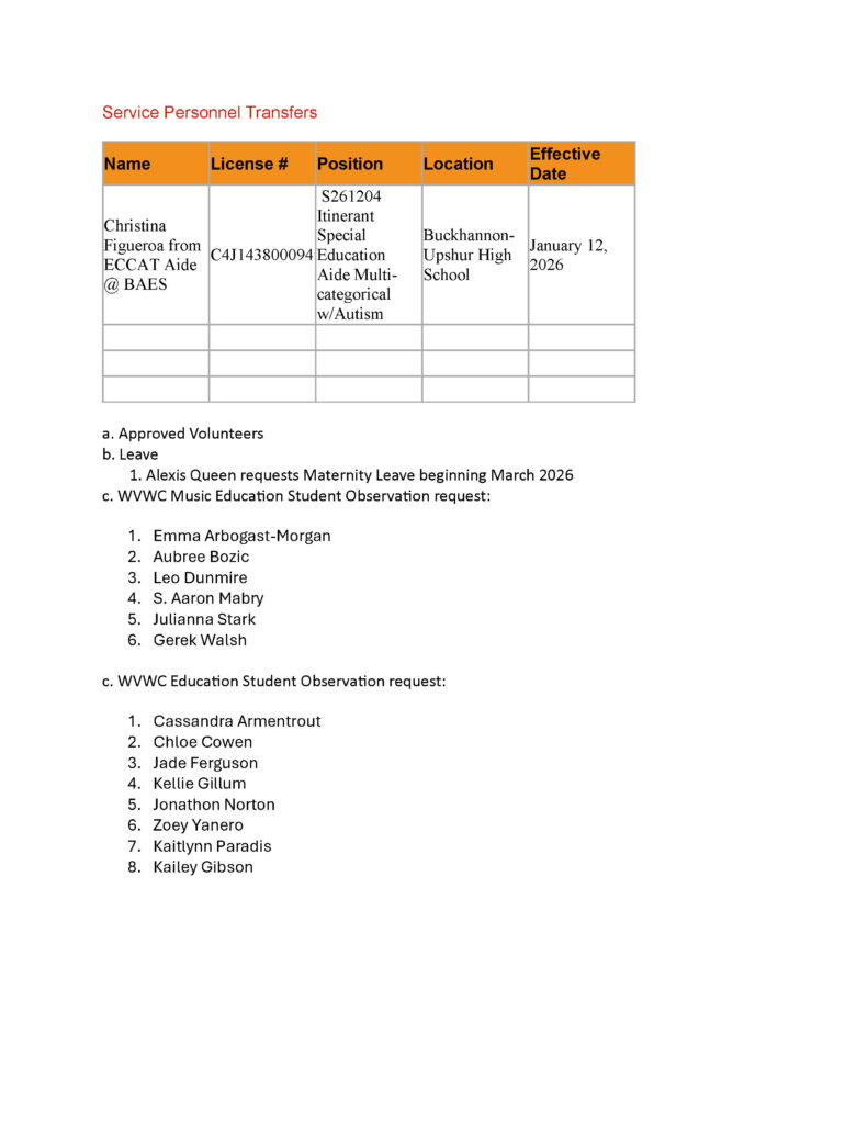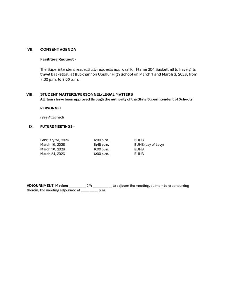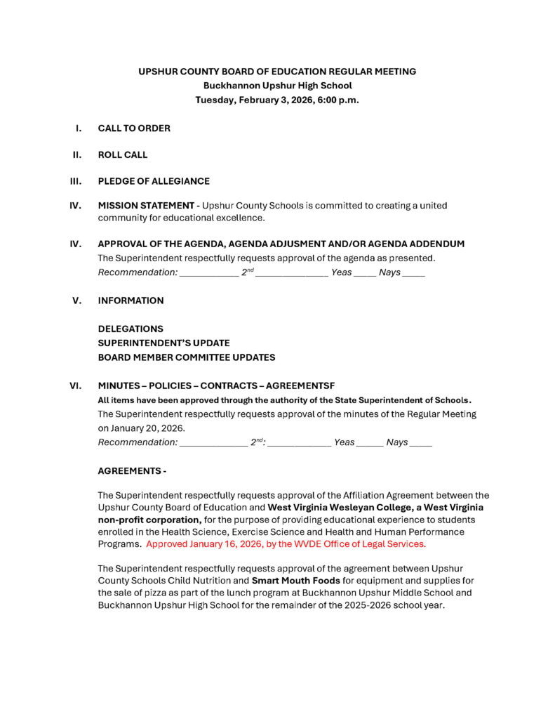 Here is the agenda for the Upshur County Board of Education meeting scheduled for February 3, 2026.