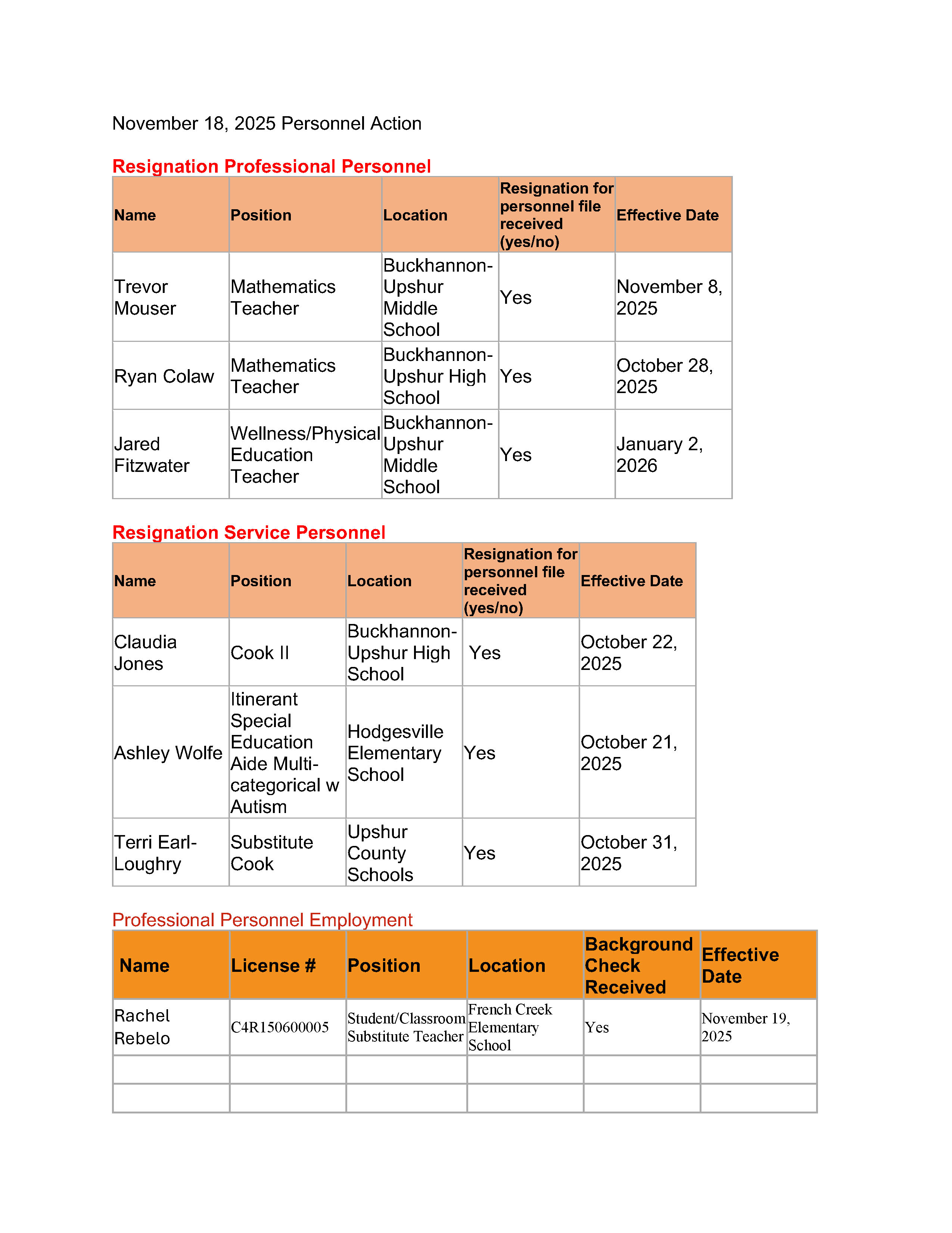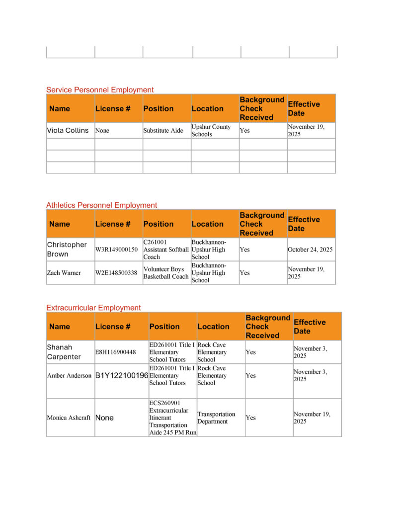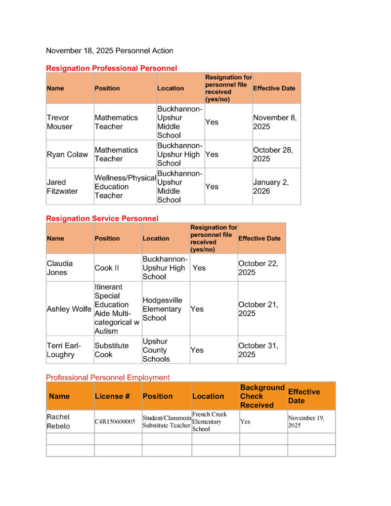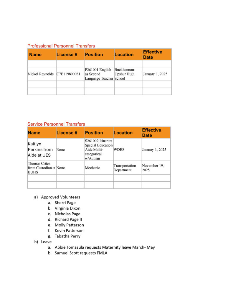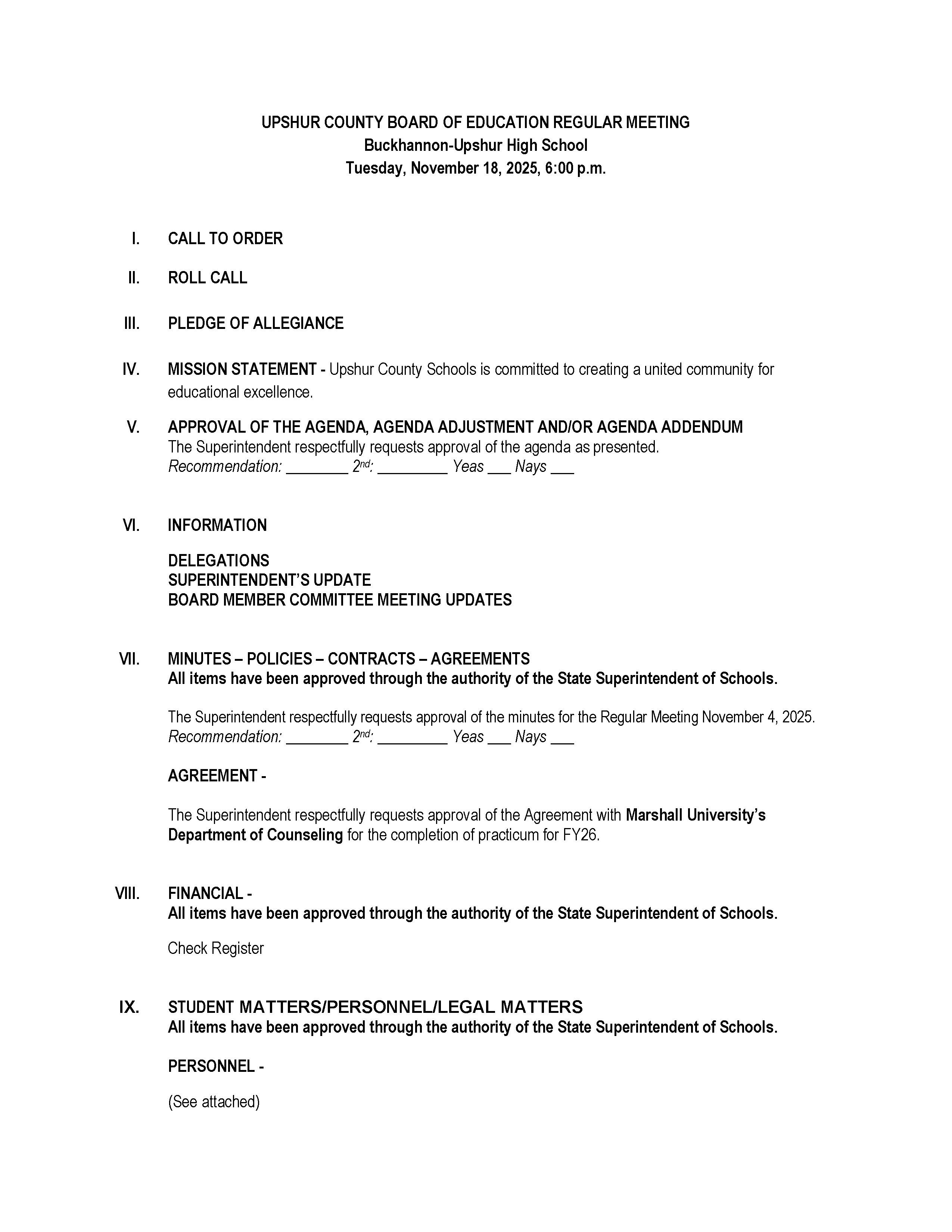 Here is the agenda for the Upshur County Board of Education meeting scheduled for November 18, 2025.