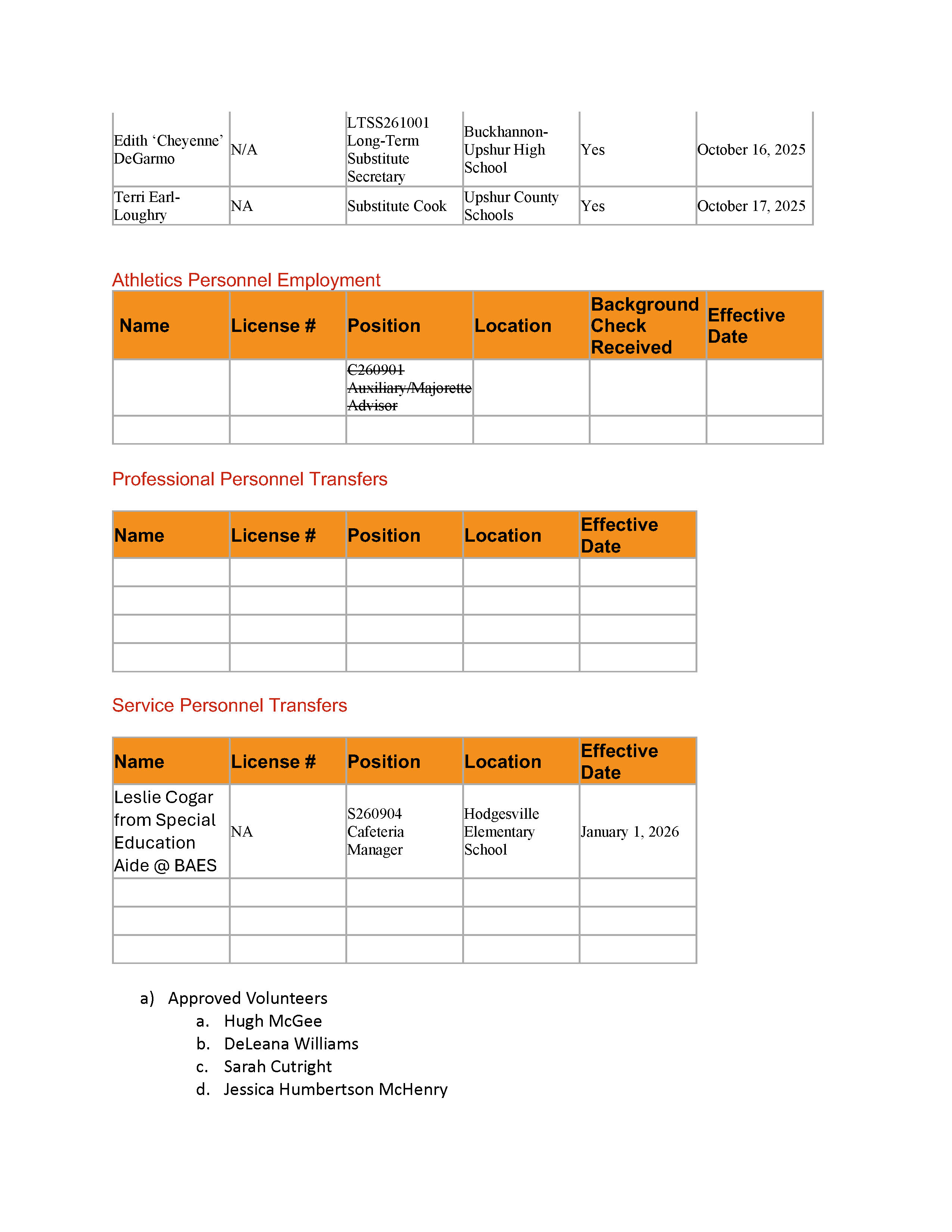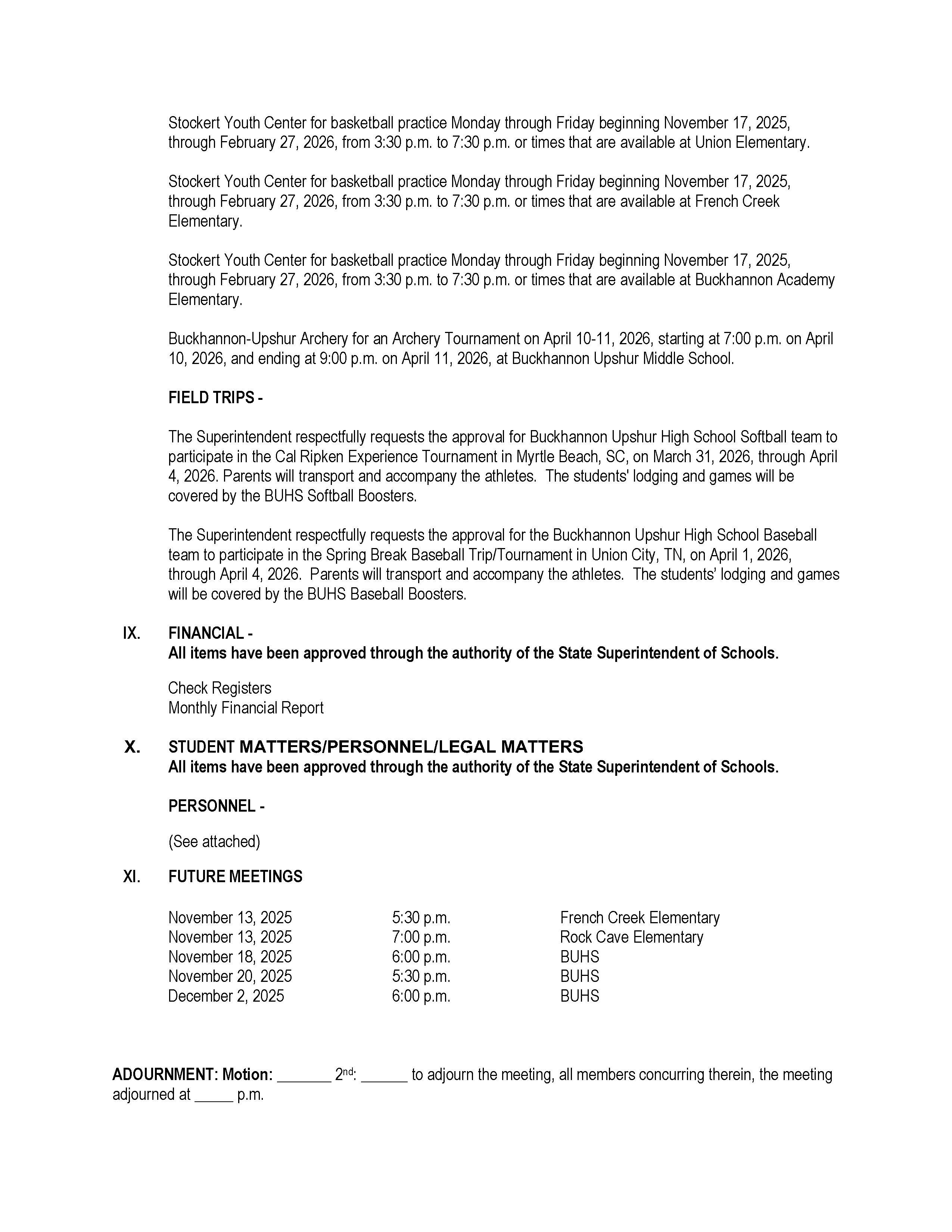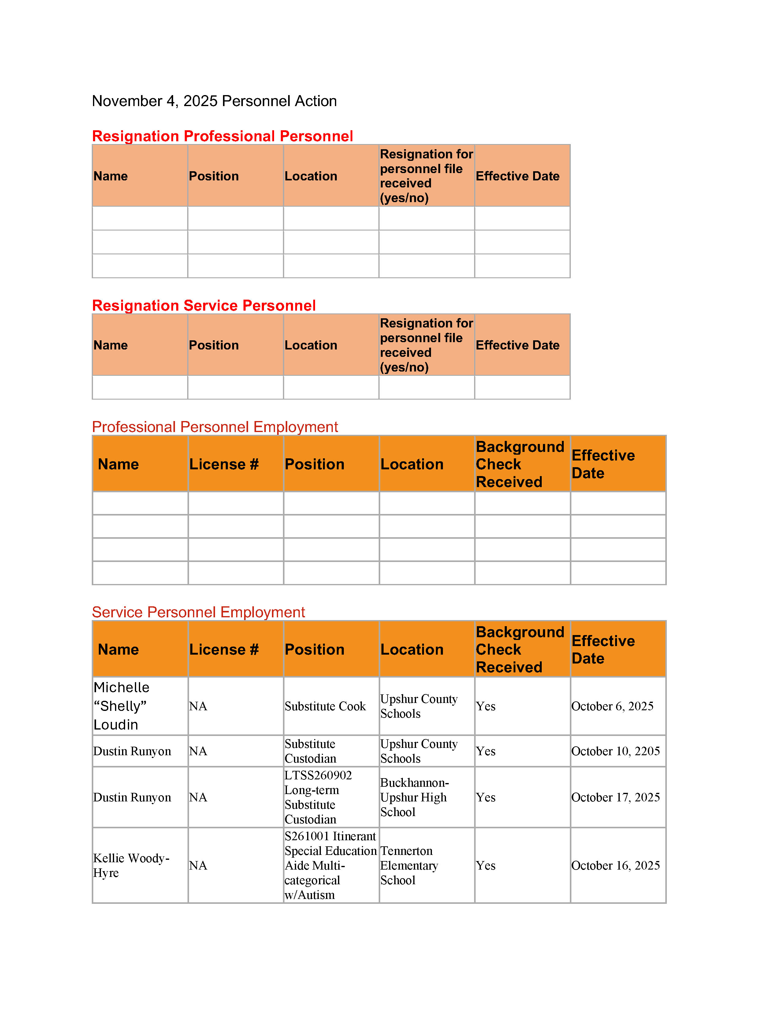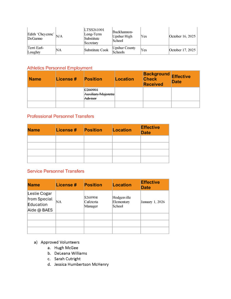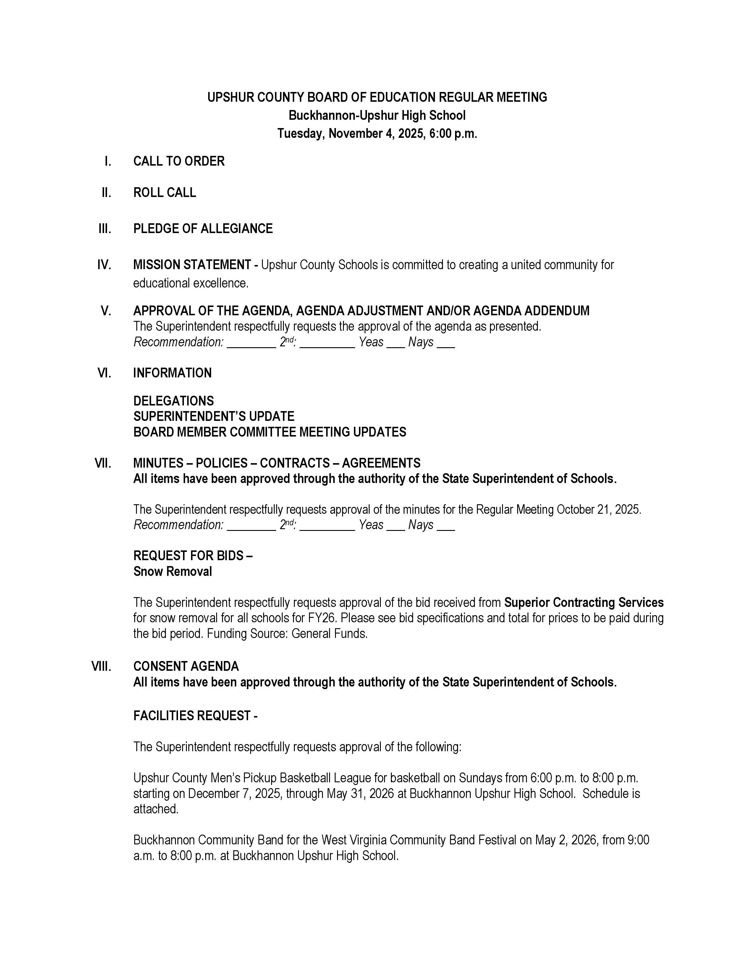 Here is the agenda for the Upshur County Board of Education meeting scheduled for November 4, 2025.