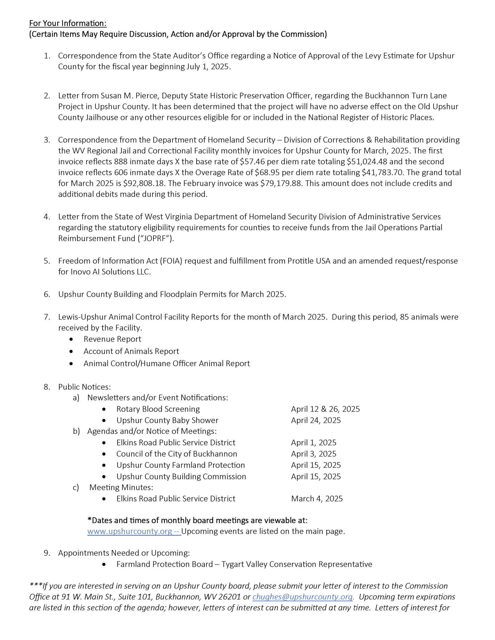 Here is the agenda for the Upshur County Commission meeting scheduled for April 10, 2025.