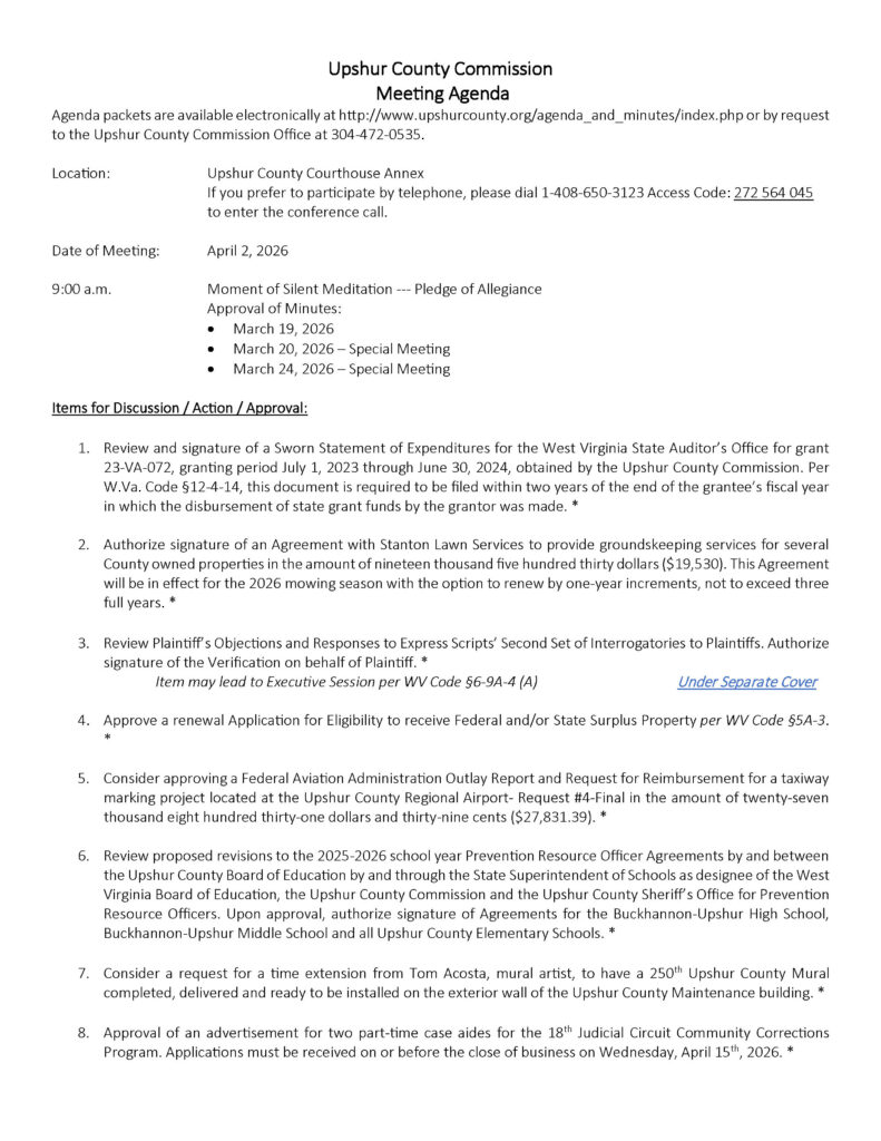Here is the agenda for the Upshur County Commission meeting scheduled for April 2, 2026.