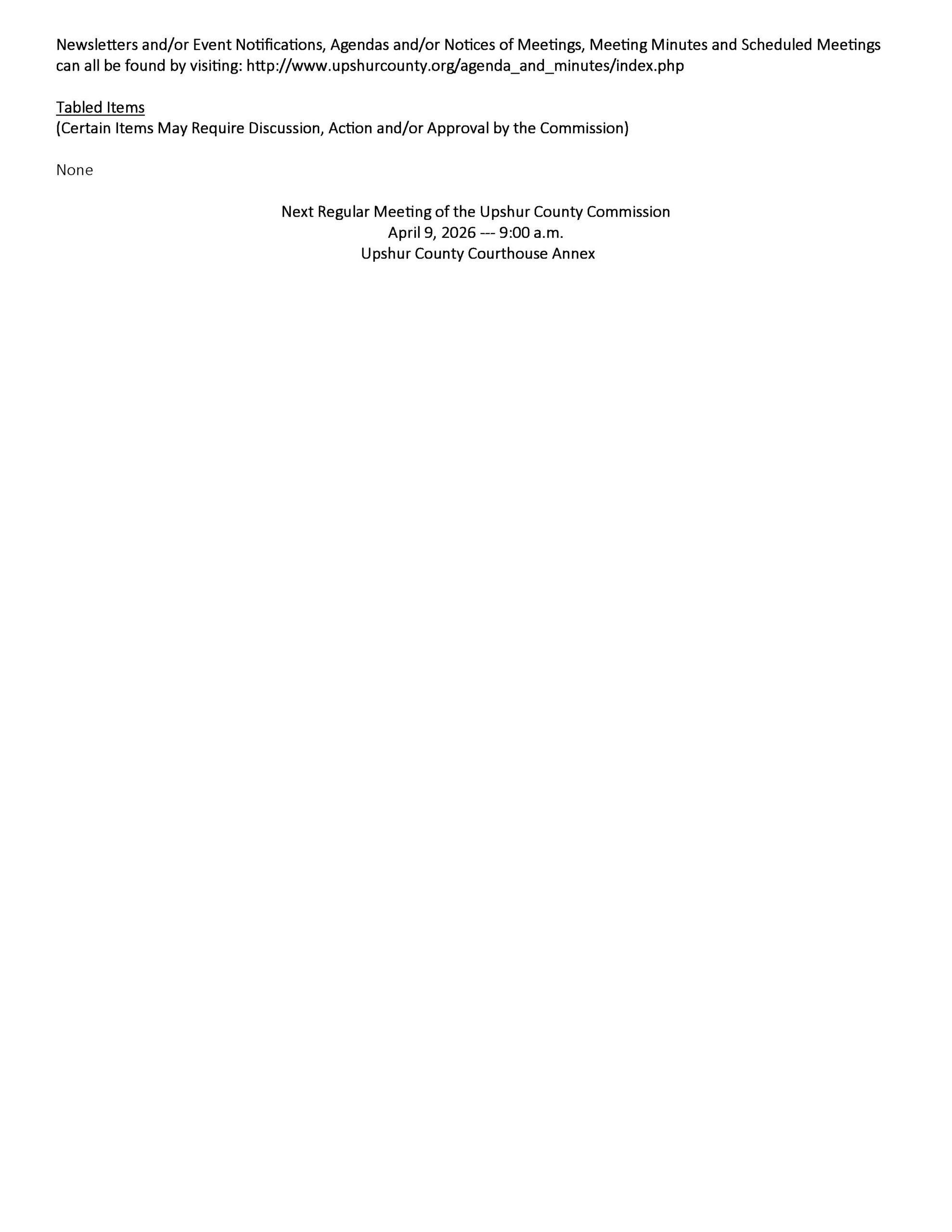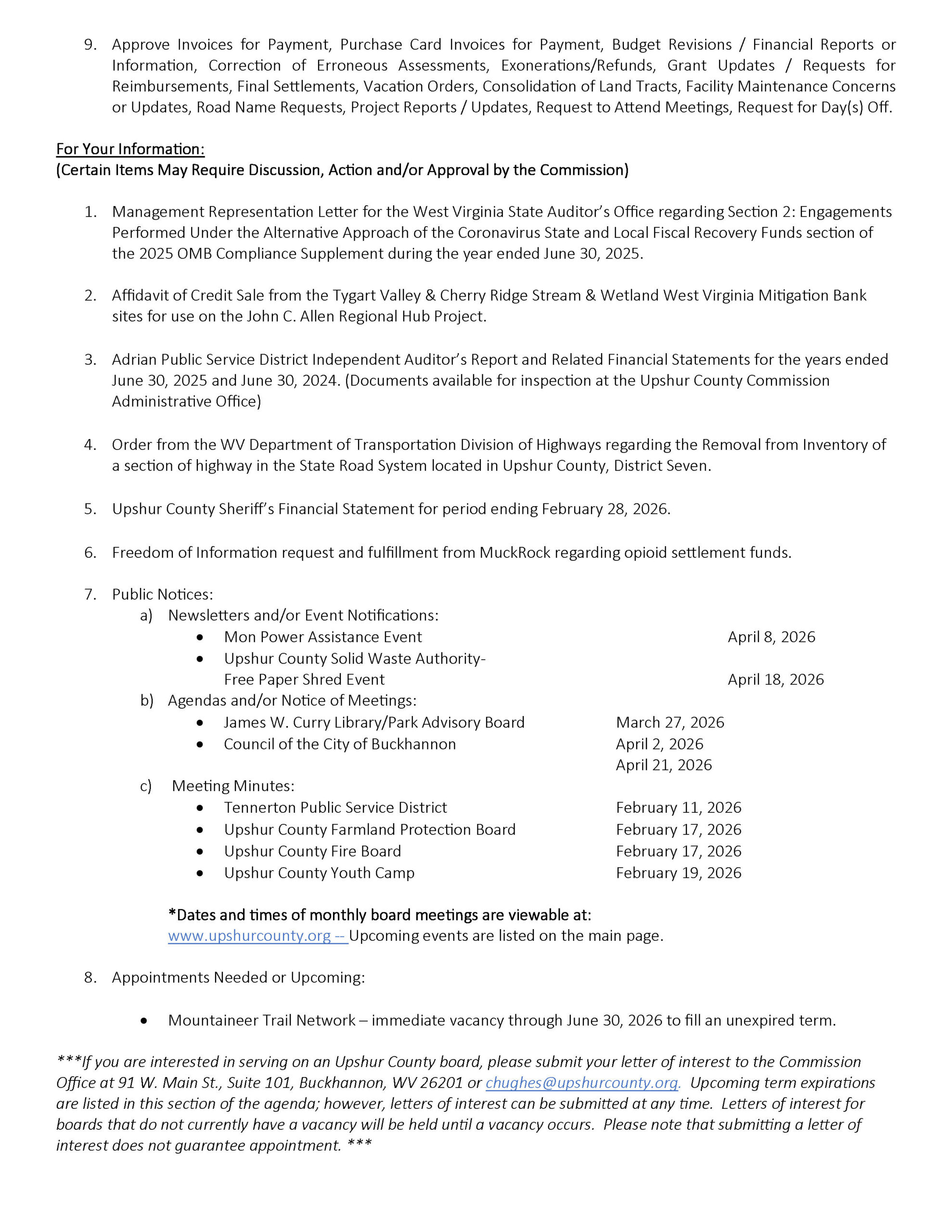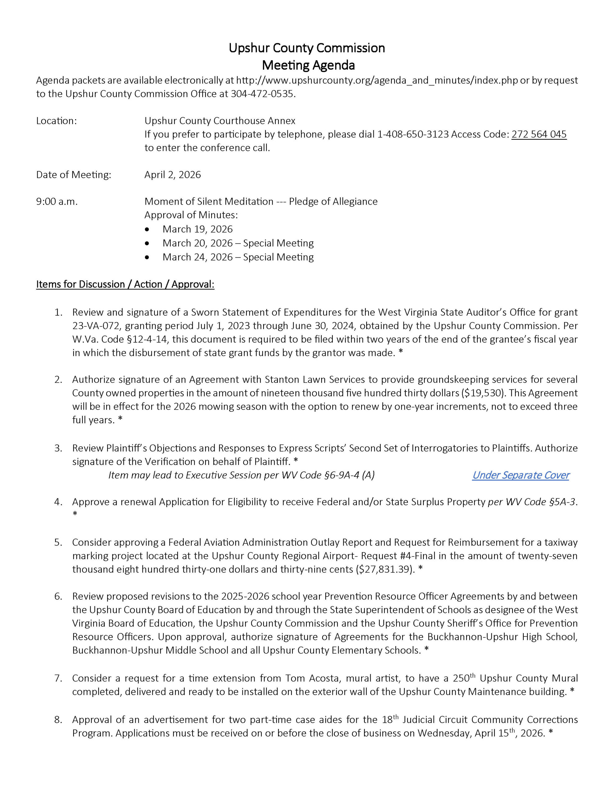 Here is the agenda for the Upshur County Commission meeting scheduled for April 2, 2026.