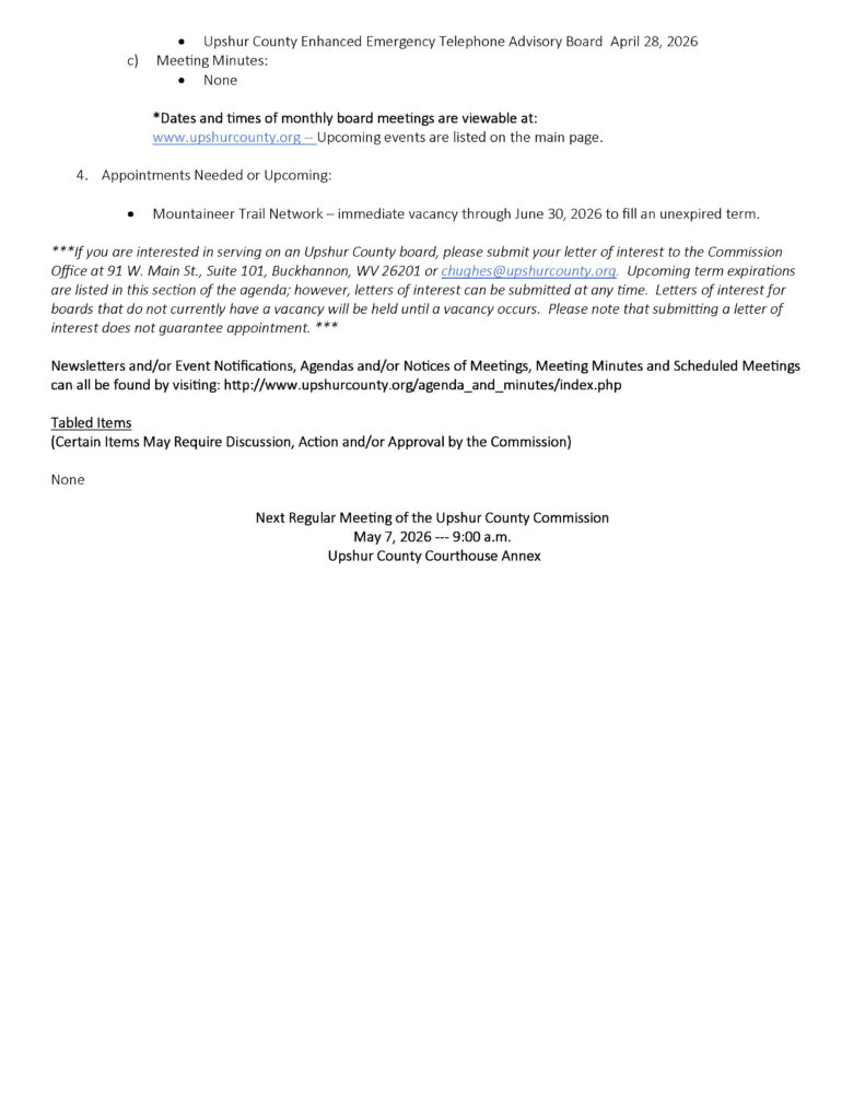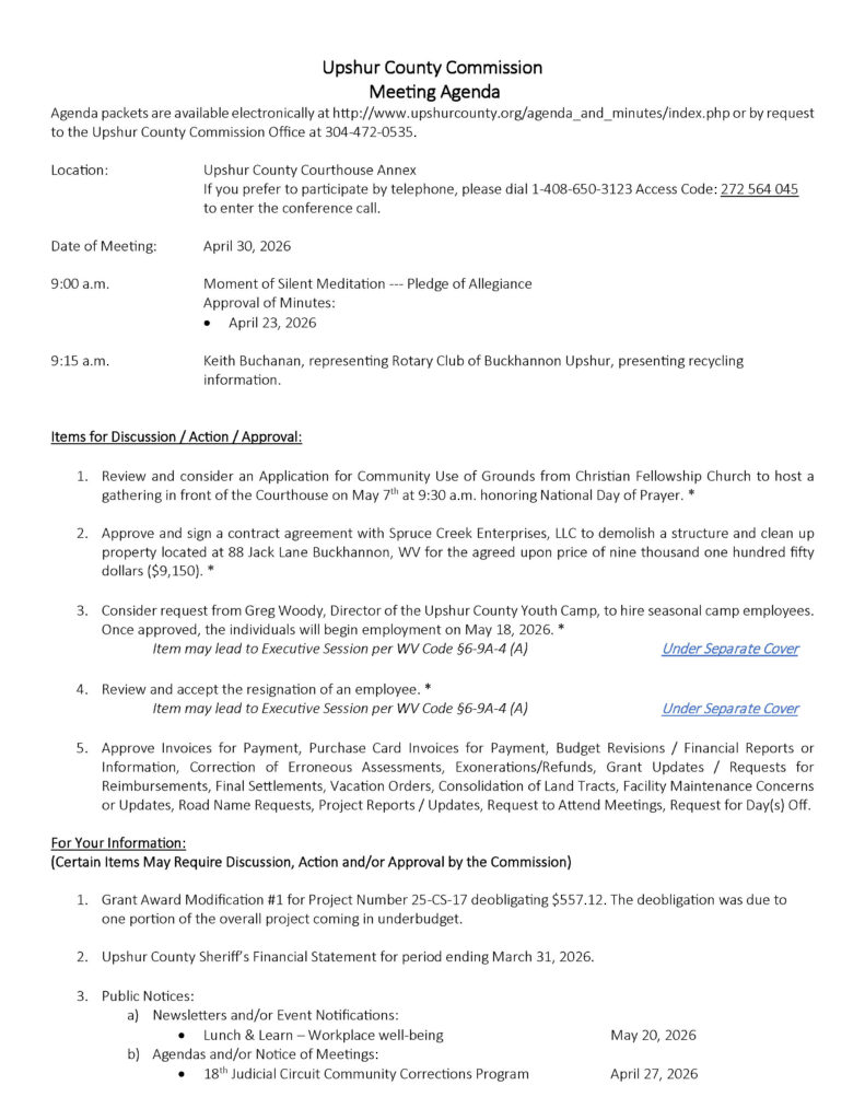 Here is the agenda for the Upshur County Commission meeting scheduled for April 30, 2026.