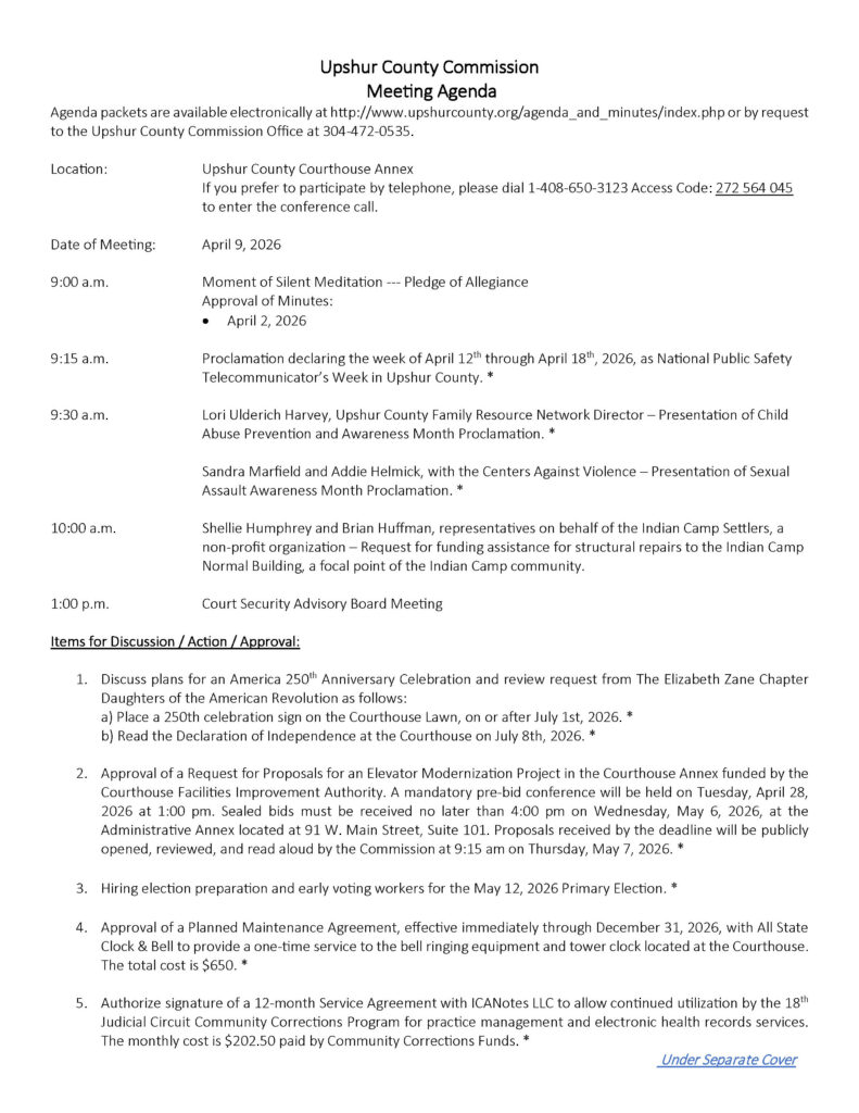 Here is the agenda for the Upshur County Commission meeting scheduled for April 9, 2026.