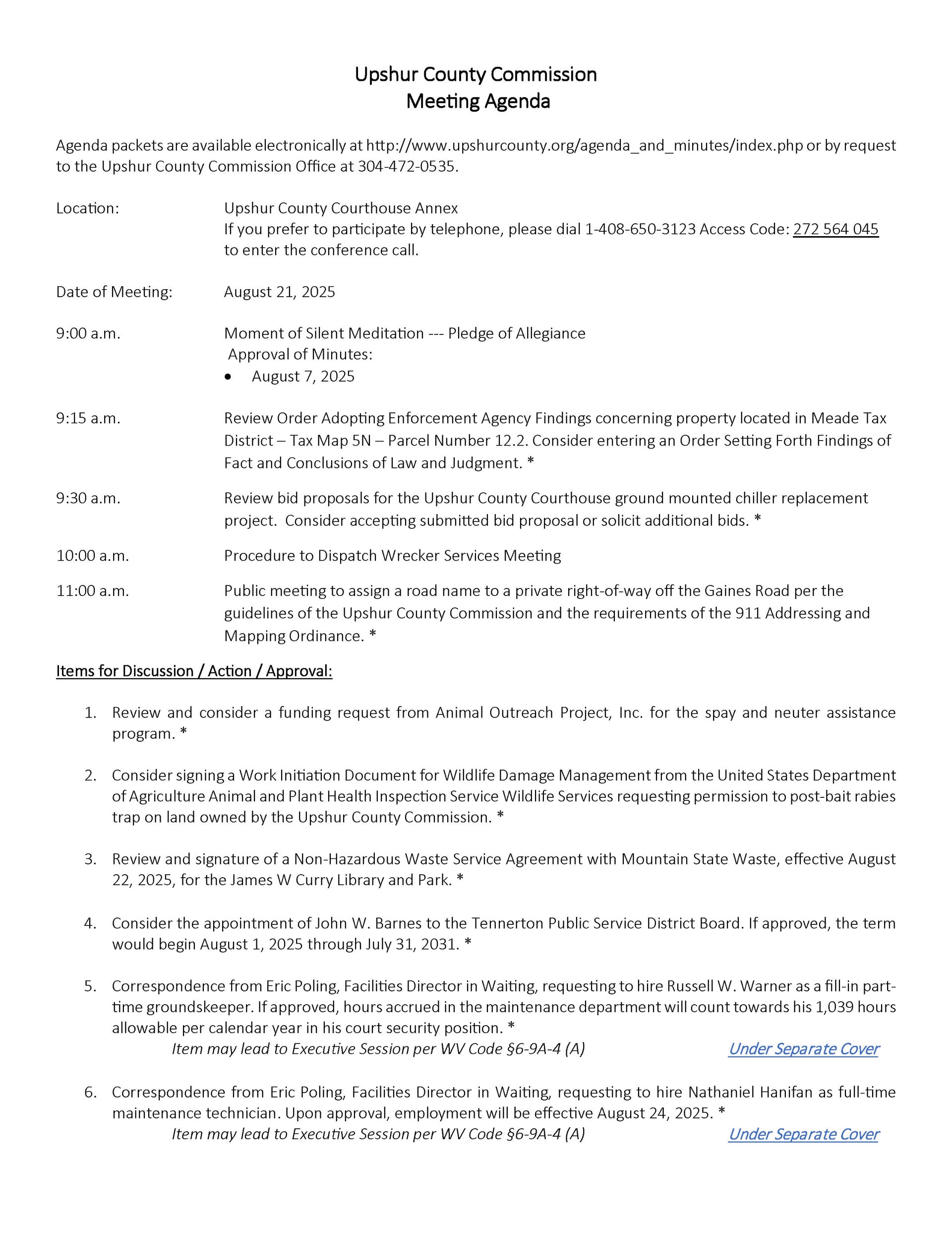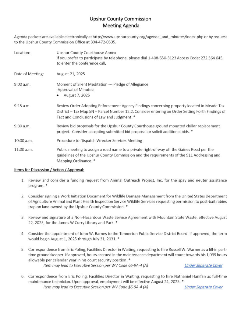 Here is the agenda for the Upshur County Commission meeting scheduled for August 21, 2025.