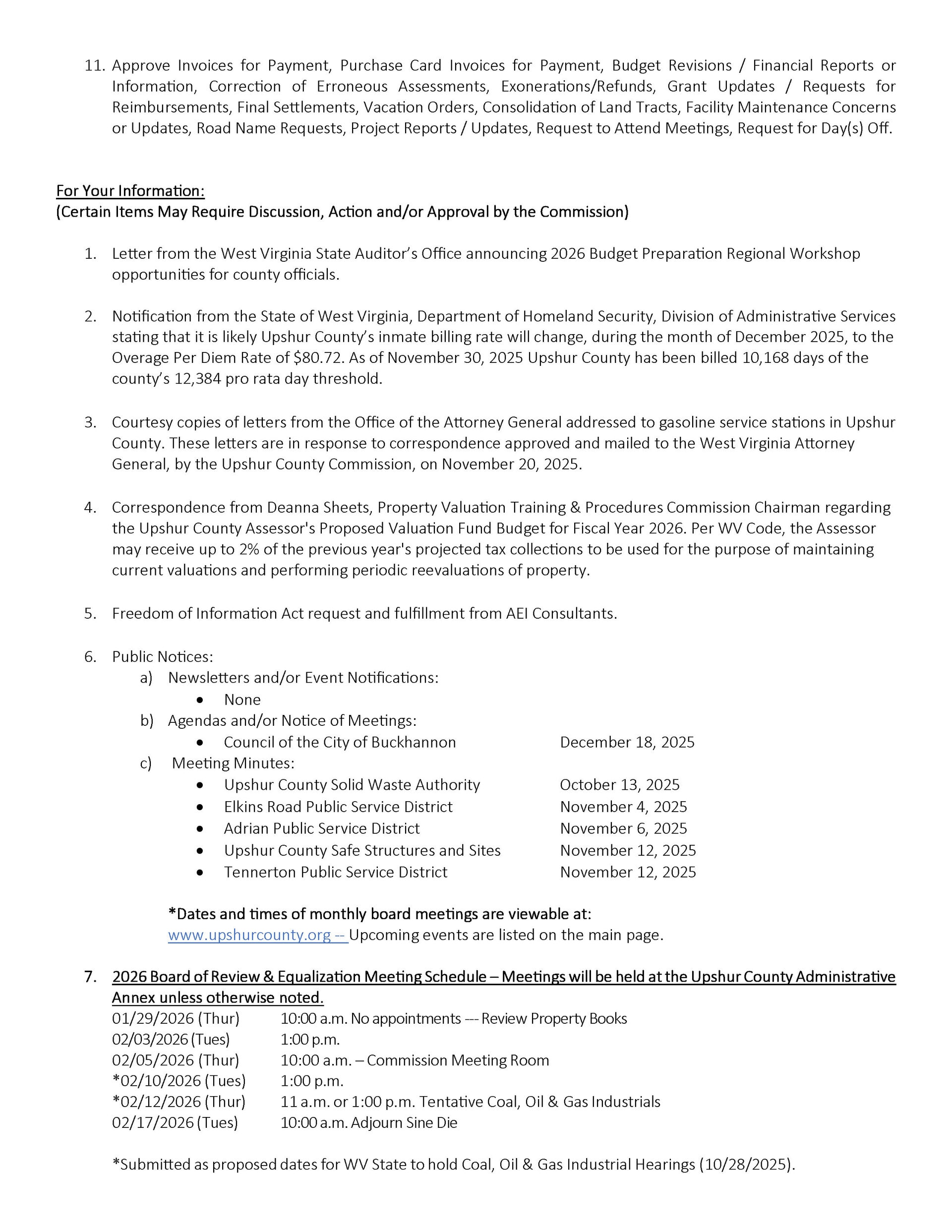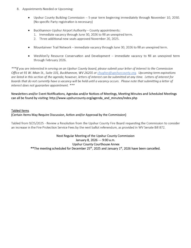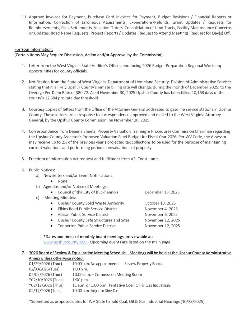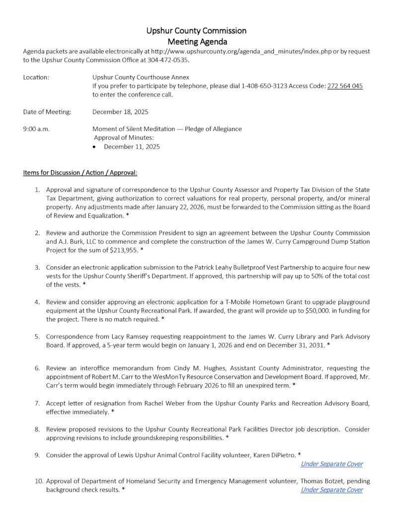 Here is the agenda for the Upshur County Commission meeting scheduled for December 18, 2025.