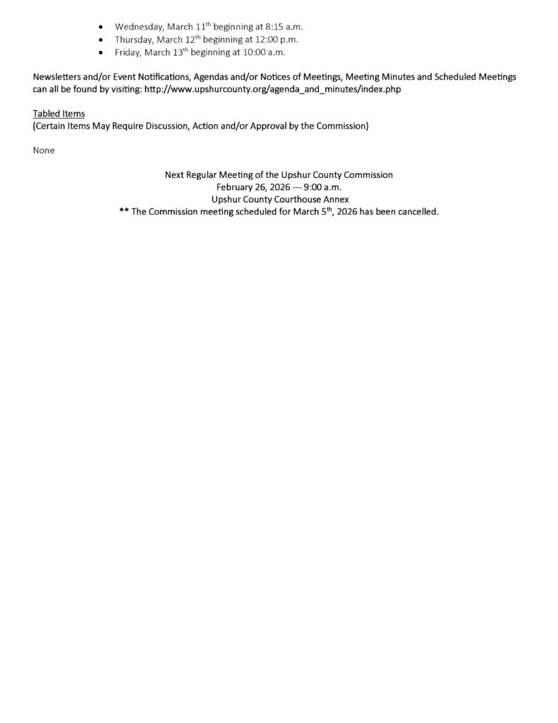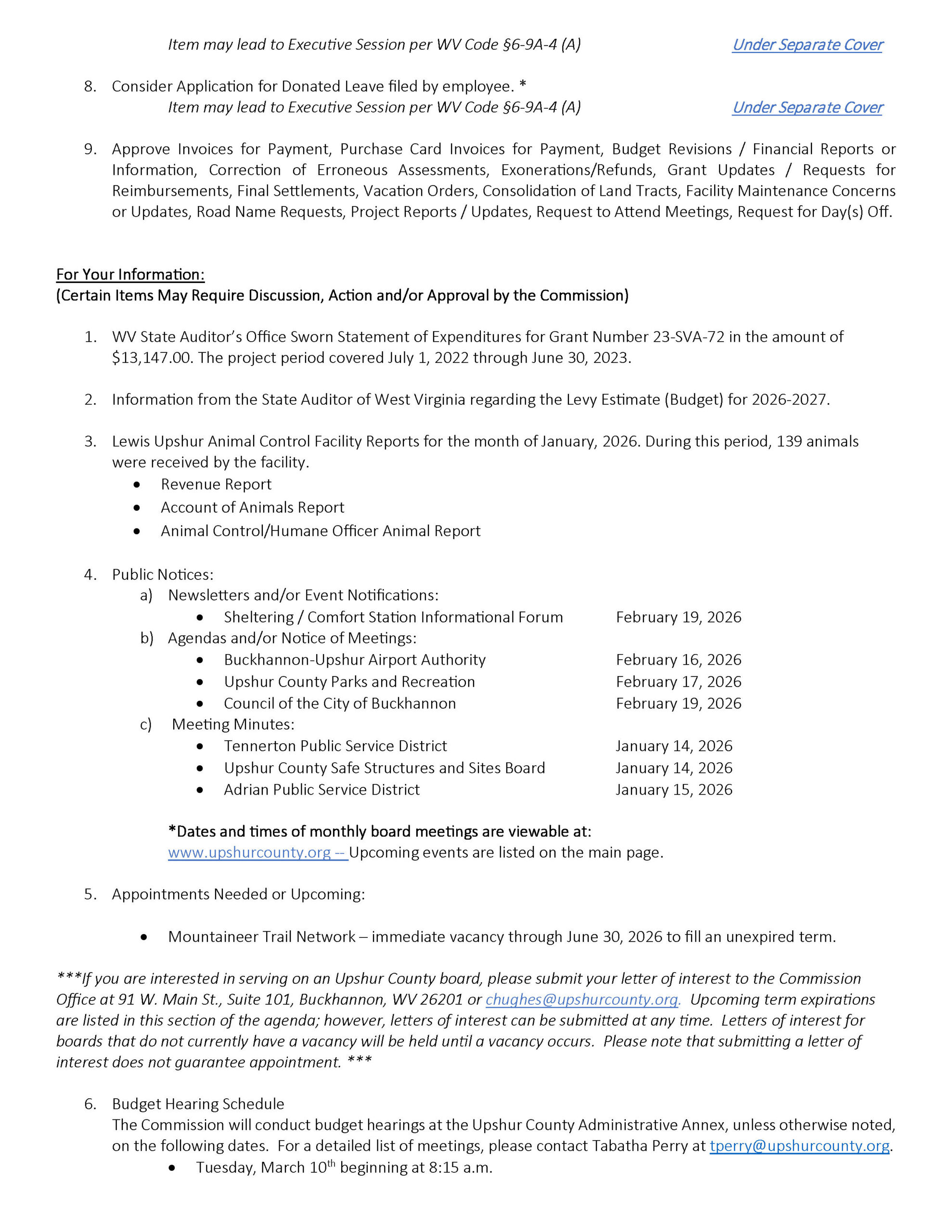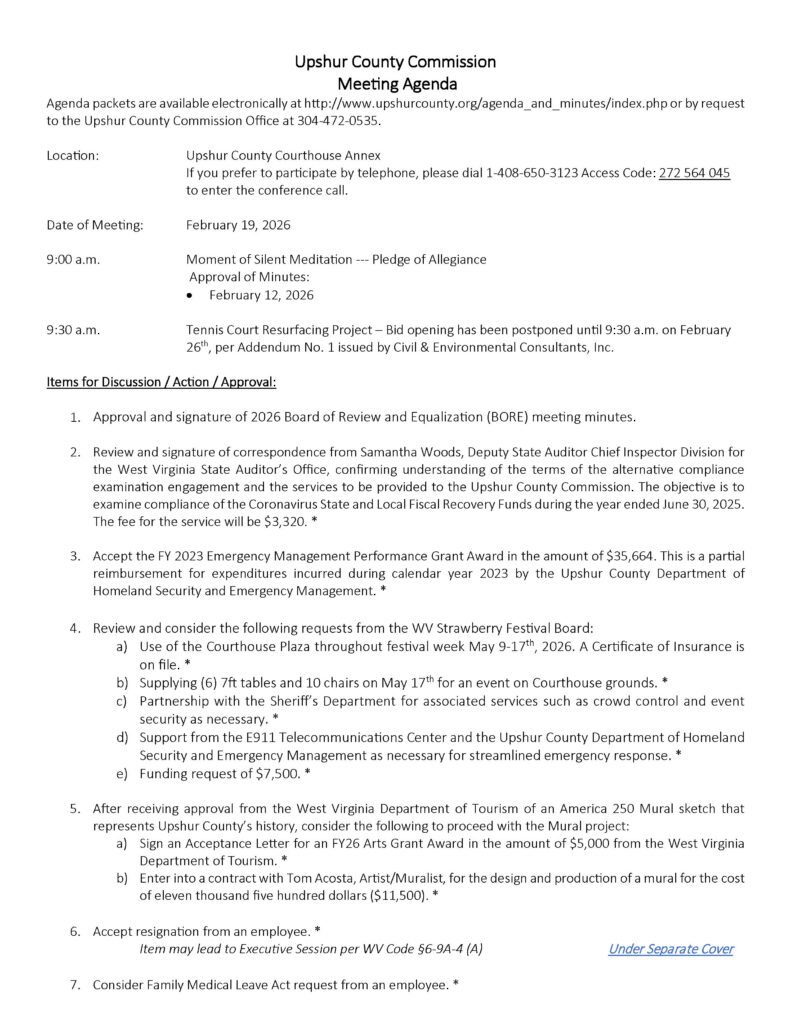 Here is the agenda for the Upshur County Commission meeting scheduled for February 19, 2026.