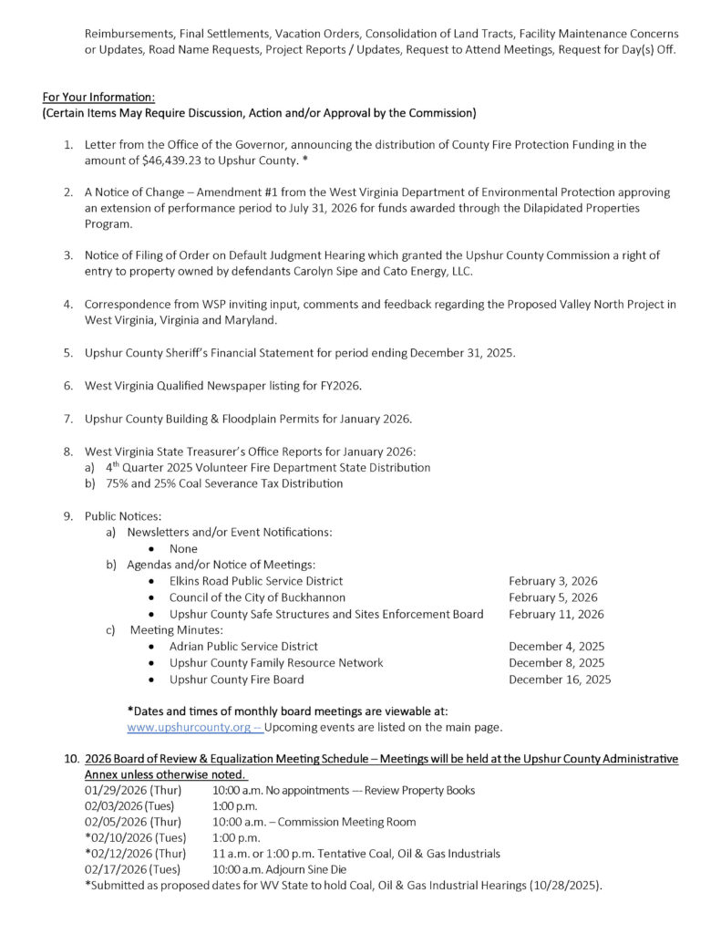 Here is the agenda for the Upshur County Commission meeting scheduled for February 5, 2026.