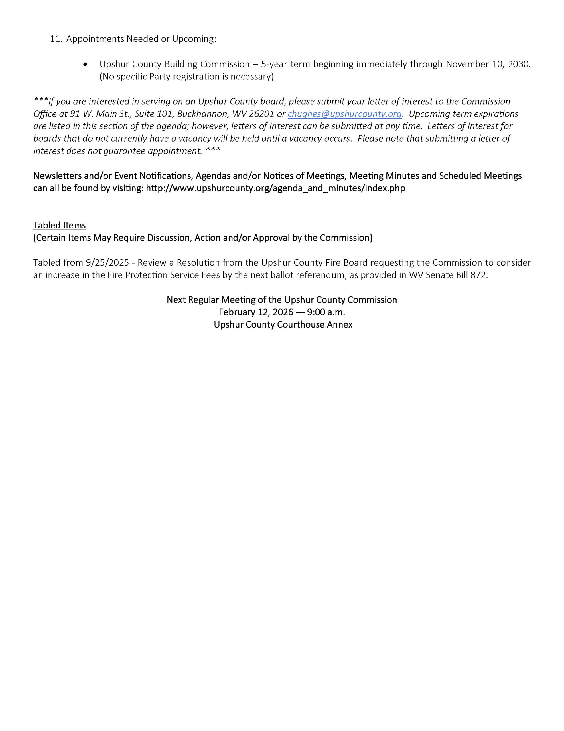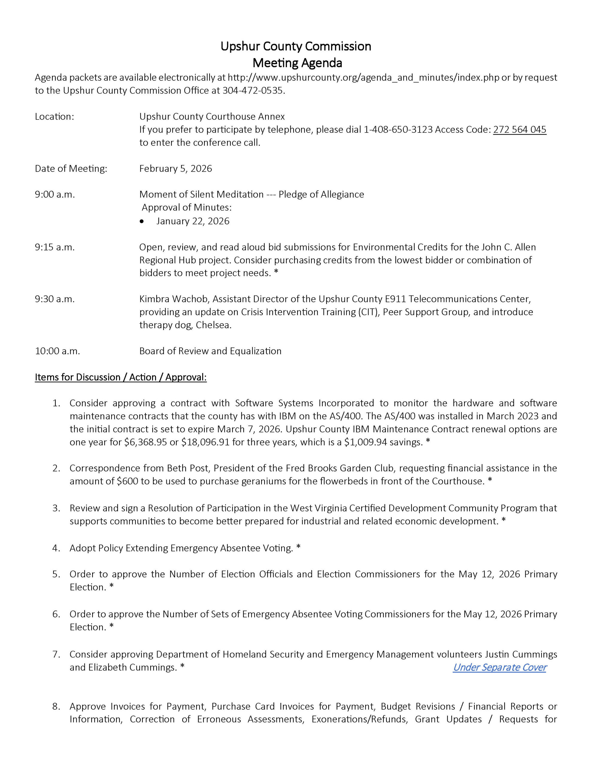 Here is the agenda for the Upshur County Commission meeting scheduled for February 5, 2026.