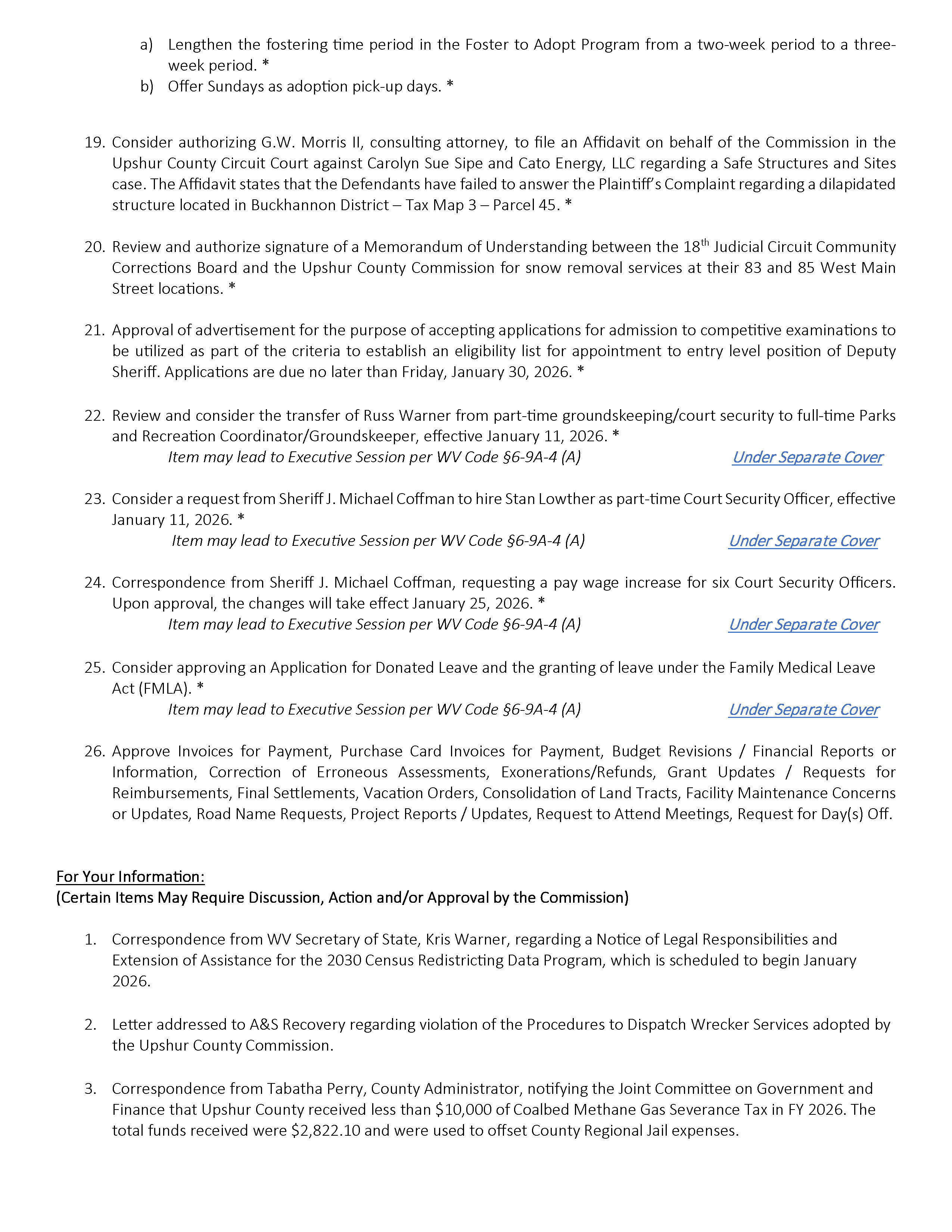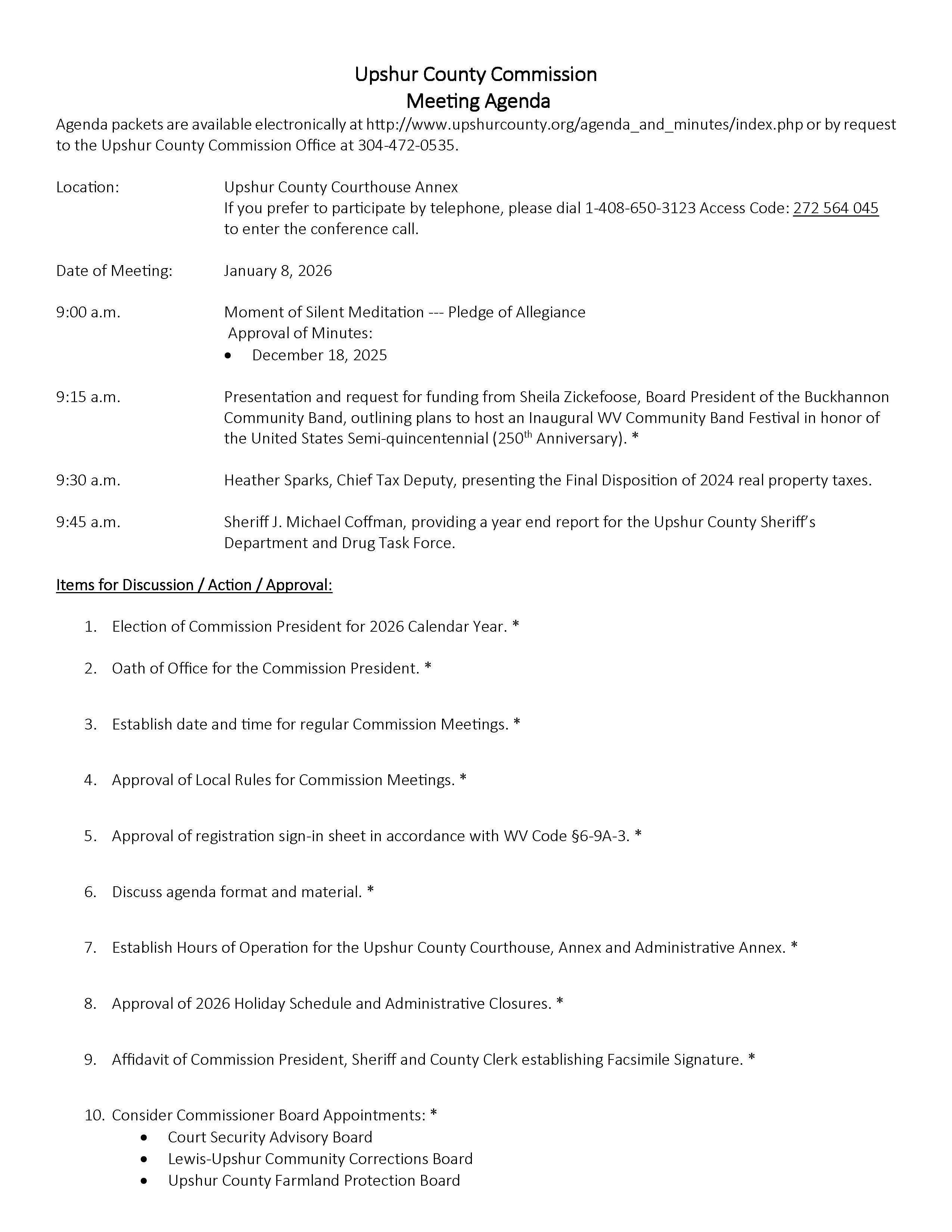 Here is the agenda for the Upshur County Commission meeting scheduled for January 8, 2026.