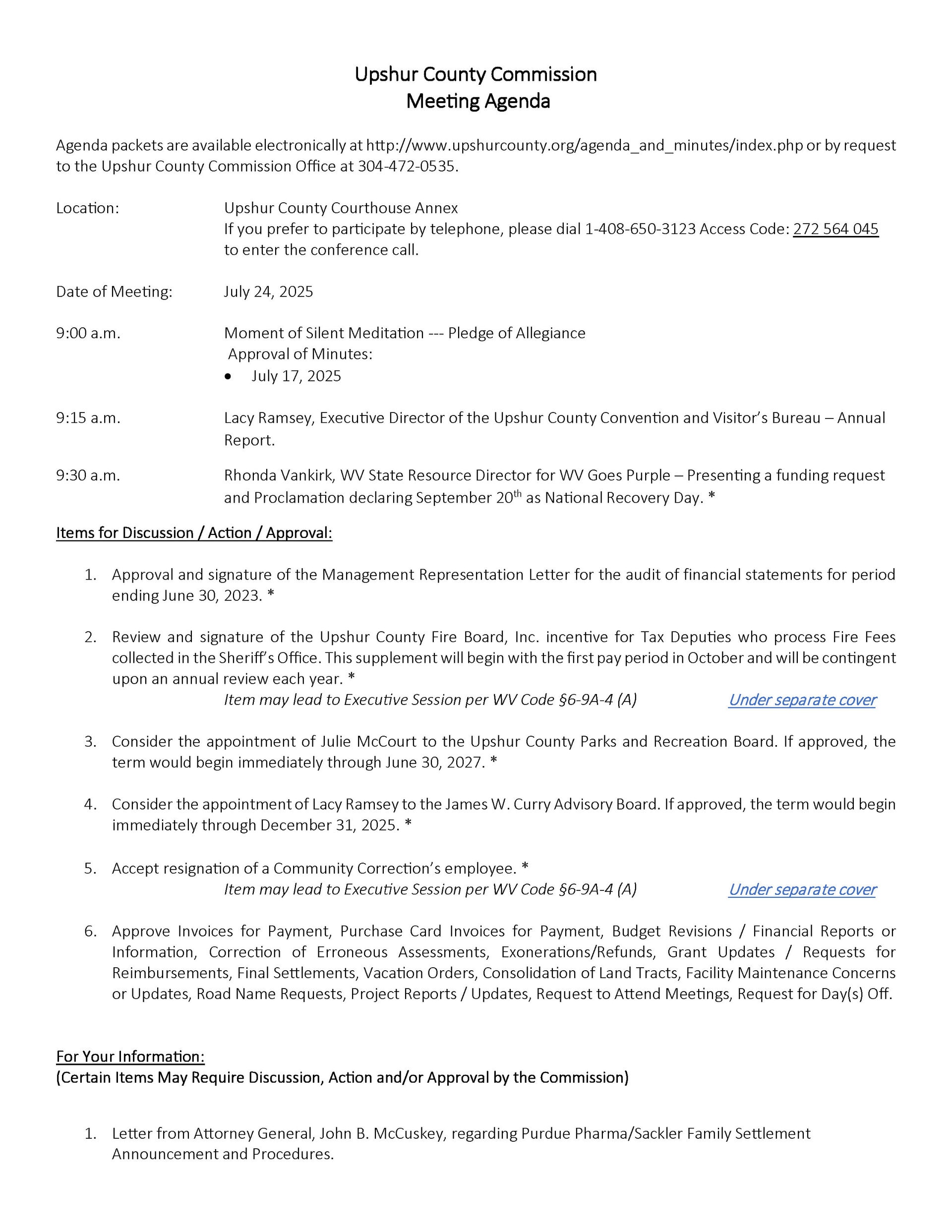 Here is the agenda for the Upshur County Commission meeting scheduled for July 24, 2025.