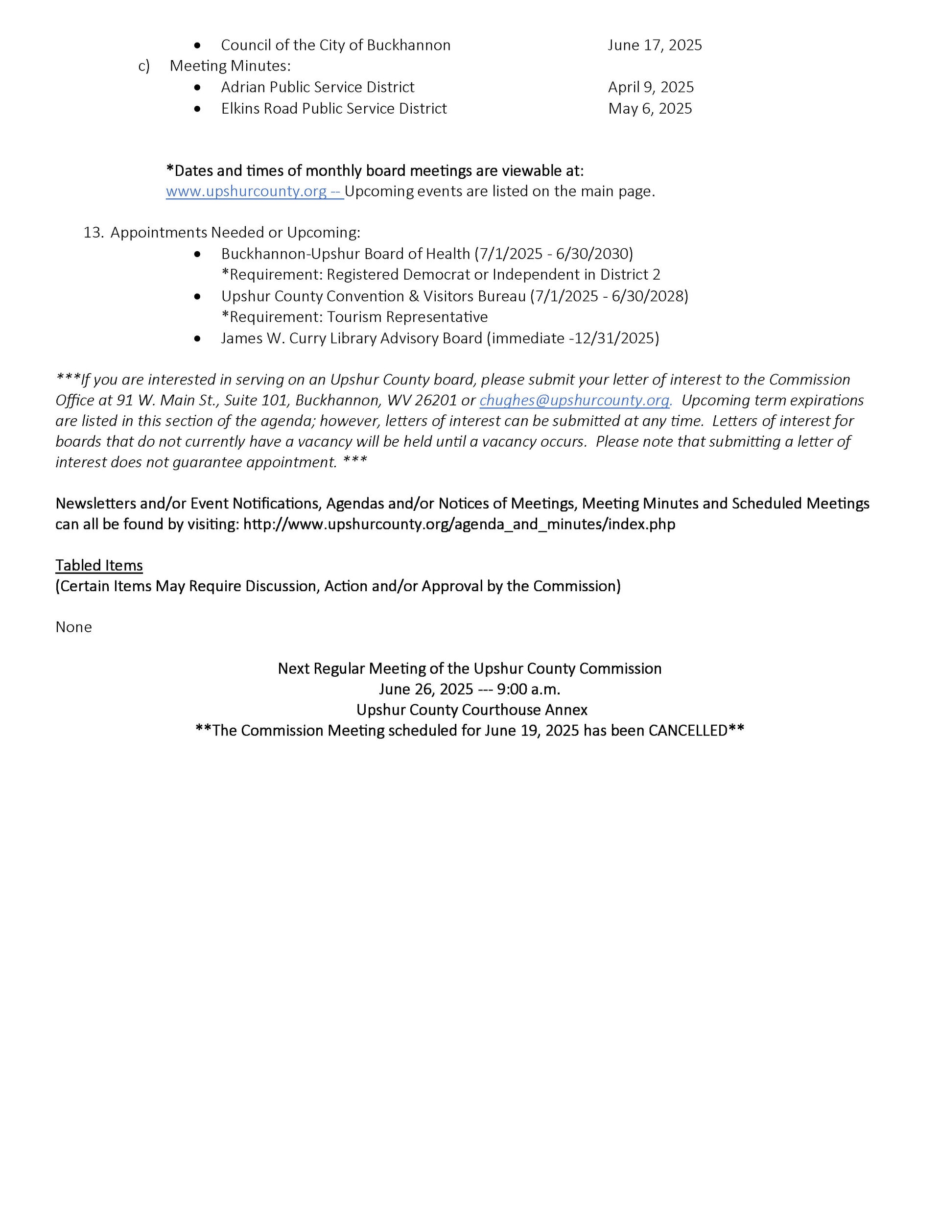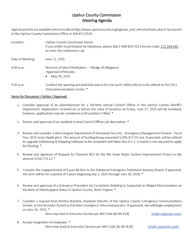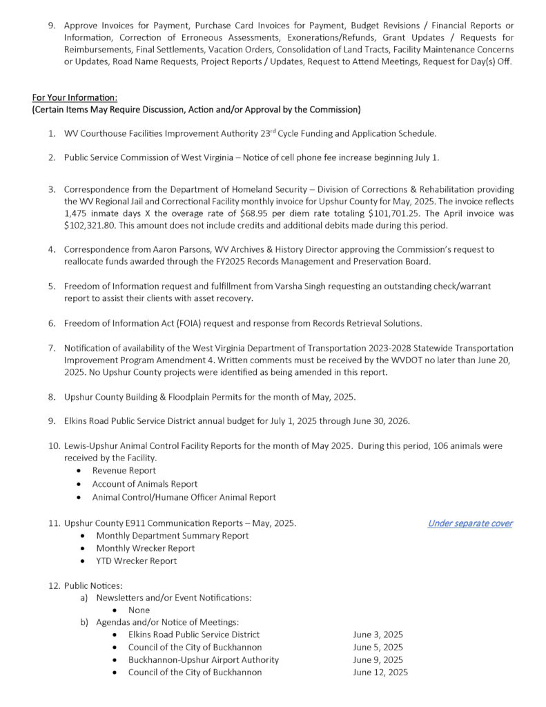 Here is the agenda for the Upshur County Commission meeting scheduled for June 12, 2025.