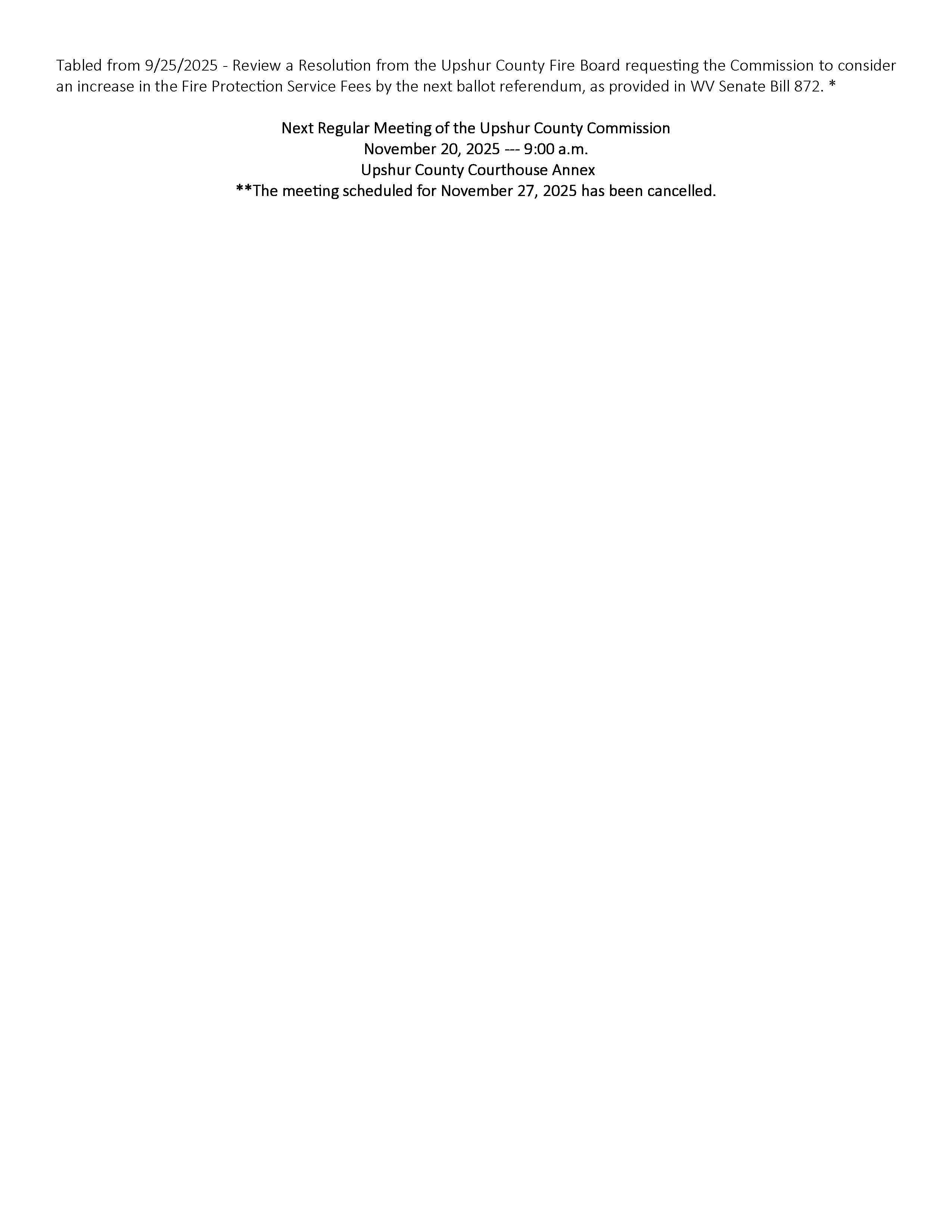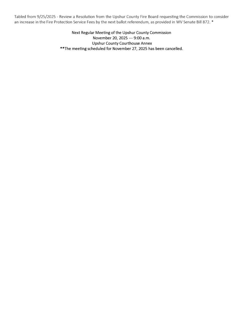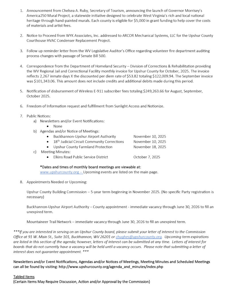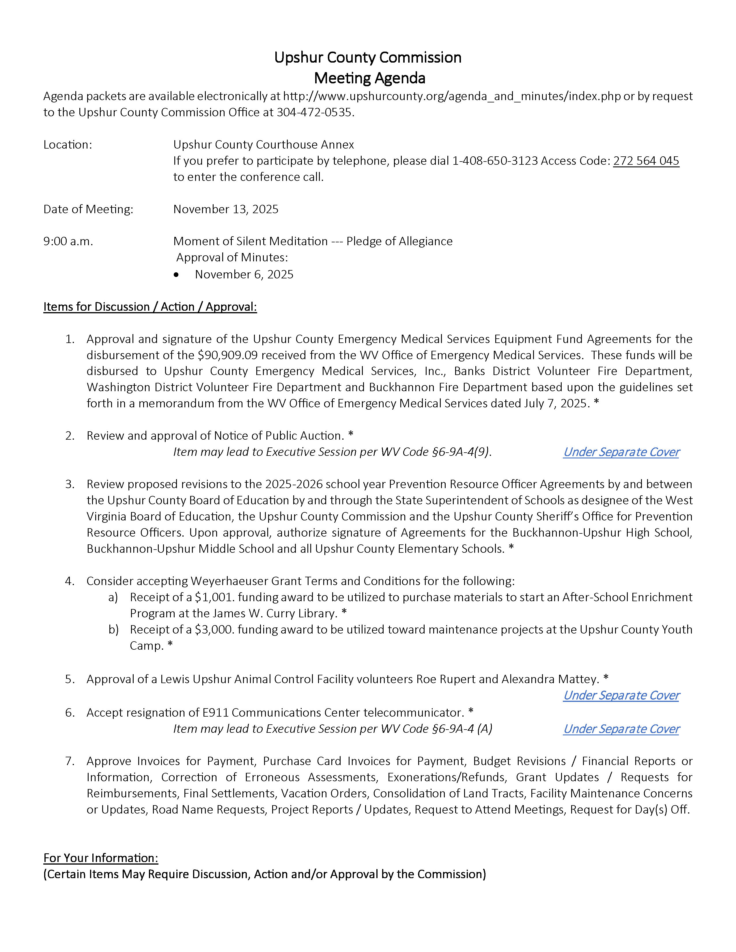 Here is the agenda for the Upshur County Commission meeting scheduled for November 13, 2025.