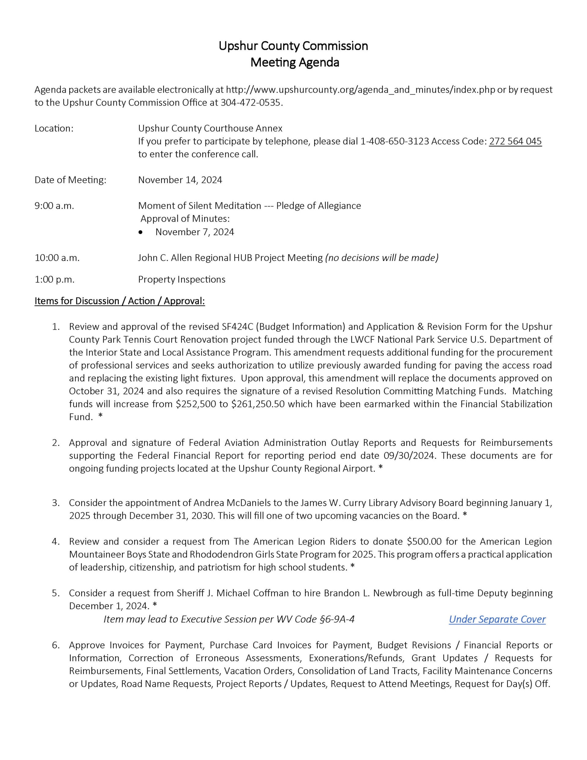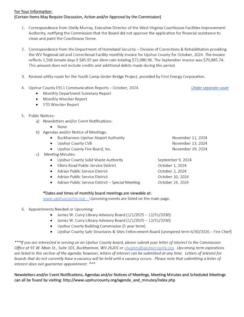 Here is the agenda for the Upshur County Commission meeting scheduled for November 14, 2024.