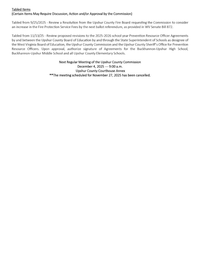 Here is the agenda for the Upshur County Commission meeting scheduled for November 20, 2025.
